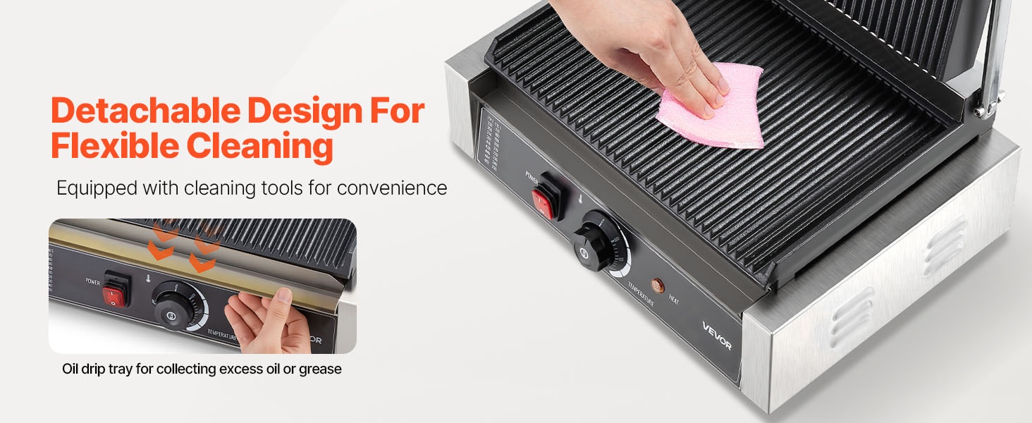 Uritettu emalipinnoitettu paistolevy antaa selkeät grillijäljet ja jakaa lämmön tasaisesti. Irrotettava rasvankeräysastia kerää levylle valuvan rasvan, öljyn ja ruoantähteet, mikä helpottaa puhdistusta ja pitää työtason siistinä.