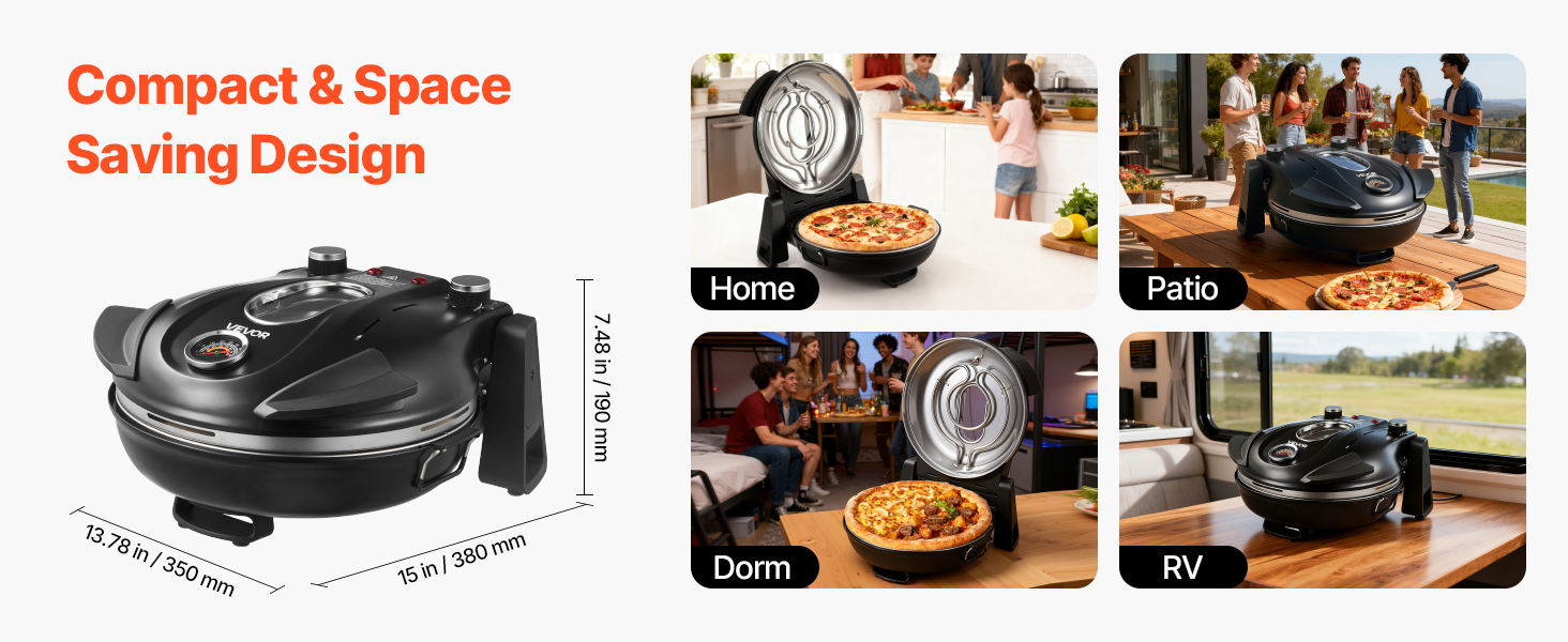 Kevyen ja kompaktin rakenteensa ansiosta pizzauuni on helppo siirtää ja säilyttää. Voit käyttää sitä sisällä tai ulkona ja järjestää pienen leivontatuokion perheen ja ystävien kanssa lähes missä tahansa.