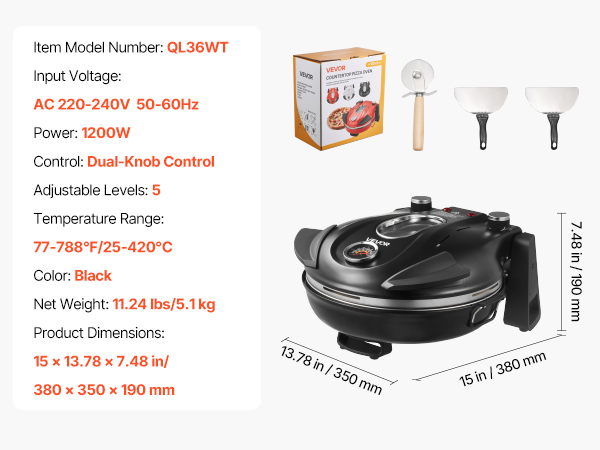 Sähköinen pizzauuni QL36WT 304,8 mm kordieriittikivellä 1200 W musta