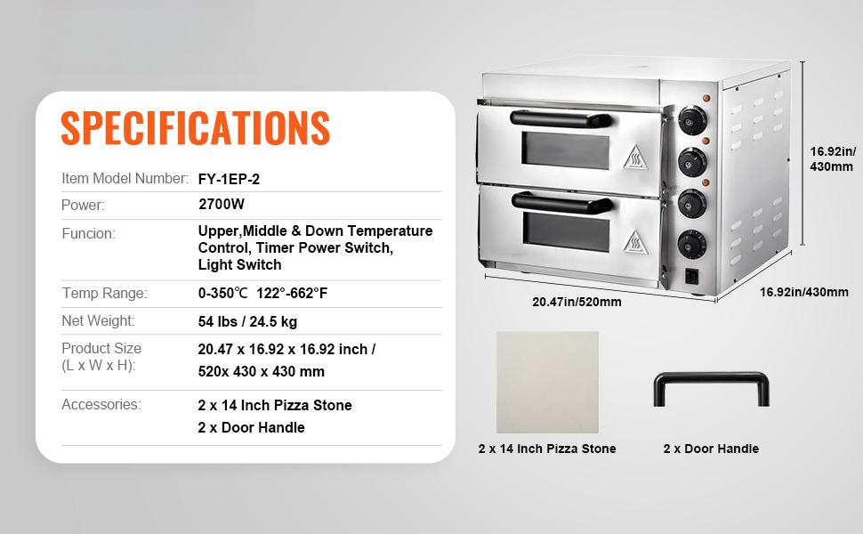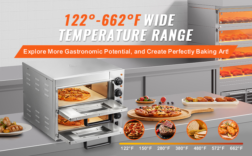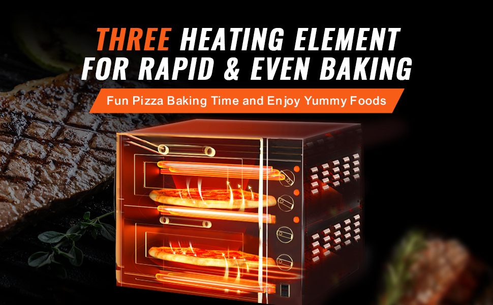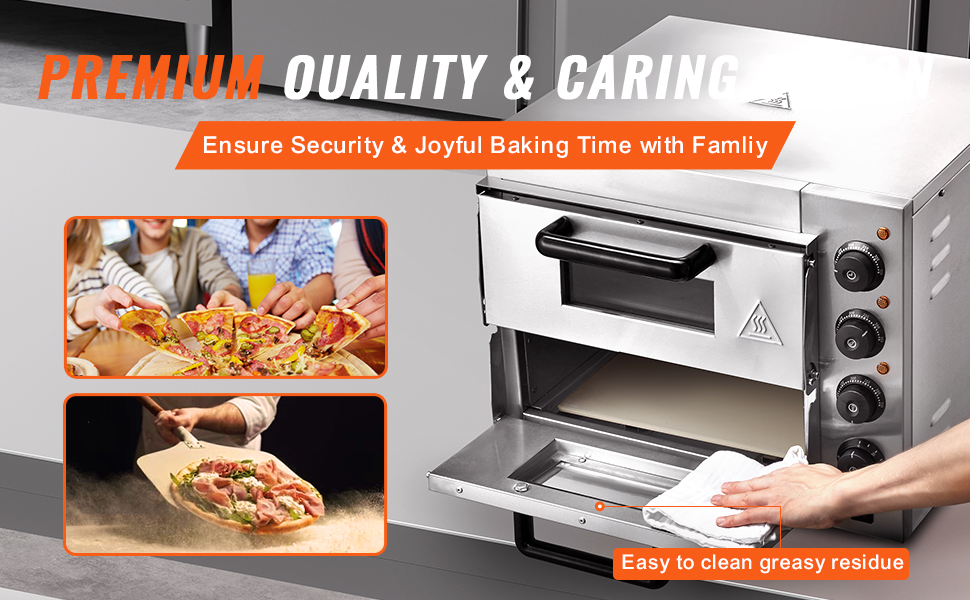 Tehokas 2700W pizzauuni kuumenee muutamassa minuutissa ja mahdollistaa herkullisten, rapeapohjaisten pizzojen valmistamisen nopeasti. Ylä- ja alapuolen kaksoislämmitysputket tarjoavat 360° tasaisen paiston ja nopean lämmönnousun, jotta ruoka kypsyy kauttaaltaan hyvin.