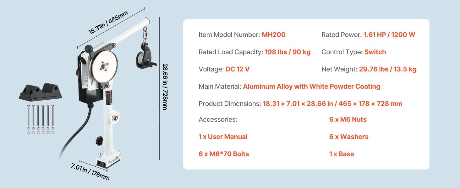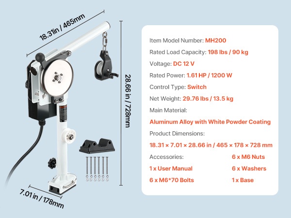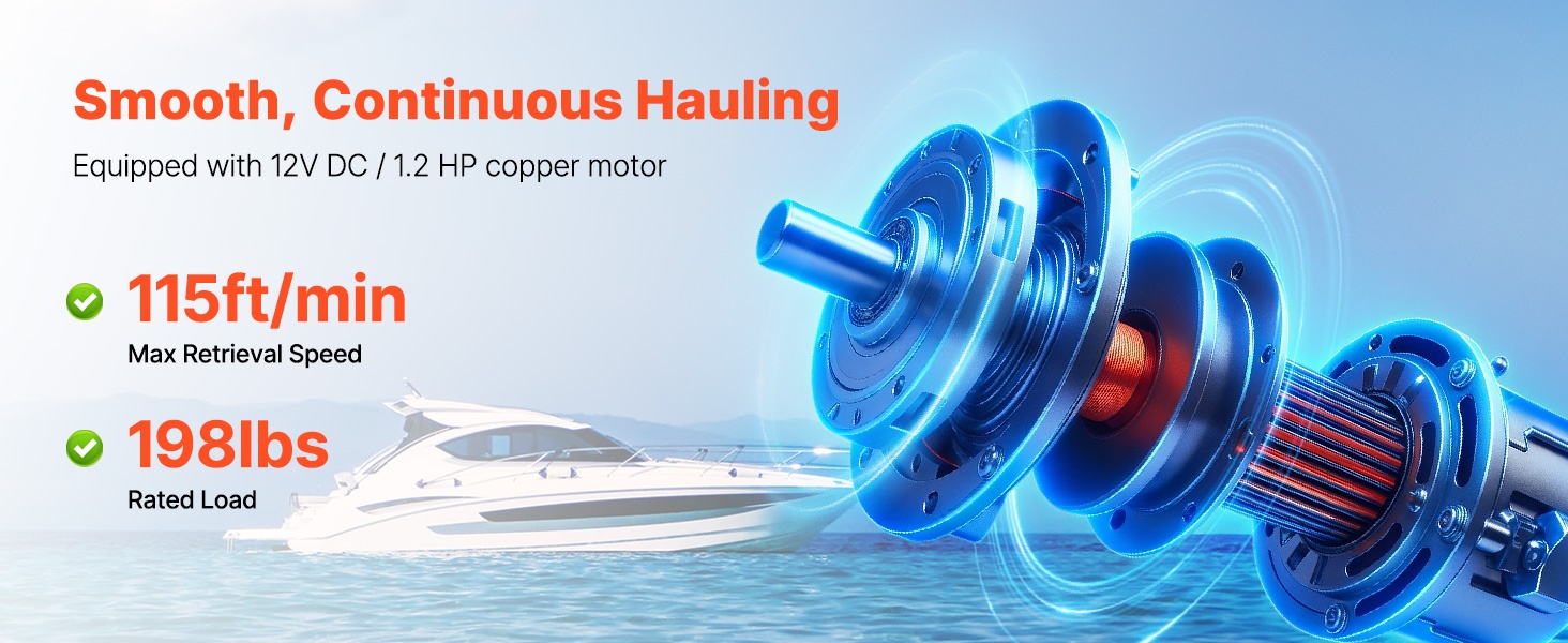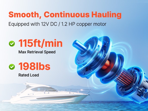 Pottavinssi toimii 12V DC / 1.2 HP kuparimoottorilla. Nimelliskuormitus on 198 lb / 90 kg ja vetonopeus jopa 115 ft/min, mikä tarjoaa tasaisen ja tehokkaan voiman syvän veden töihin.