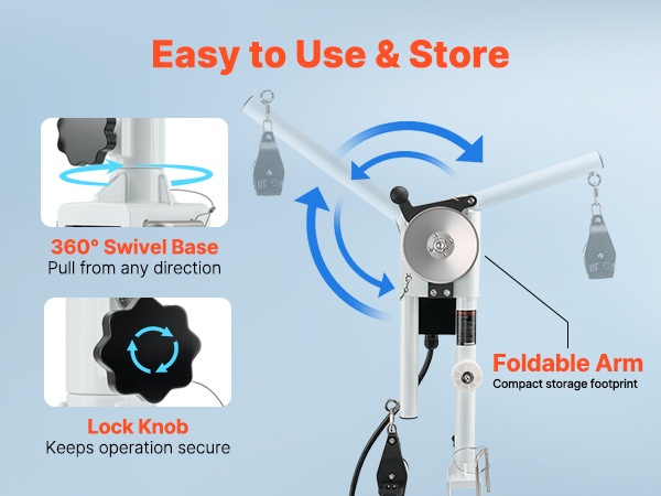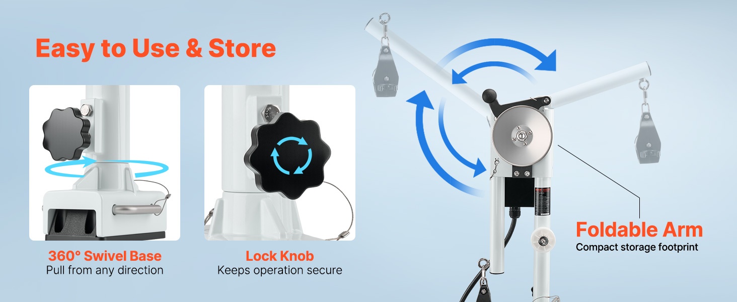 Sisäänrakennettu taittuva puomi kääntyy vapaasti suuntaan, joka sopii nostotilanteeseen, eikä vie turhaa tilaa. 360° kääntyvä jalusta mahdollistaa sujuvan liikkeen, ja kiinnitysnuppi pitää laitteen tukevasti paikoillaan helppoa käyttöä ja säilytystä varten.