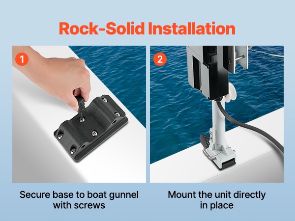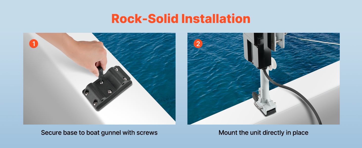Pakkaus sisältää jalustan, pultit ja mutterit. Voit kiinnittää pottavinssin tukevasti veneen kaiteeseen muutamassa minuutissa, jolloin toiminta pysyy vakaana ilman heilumista.