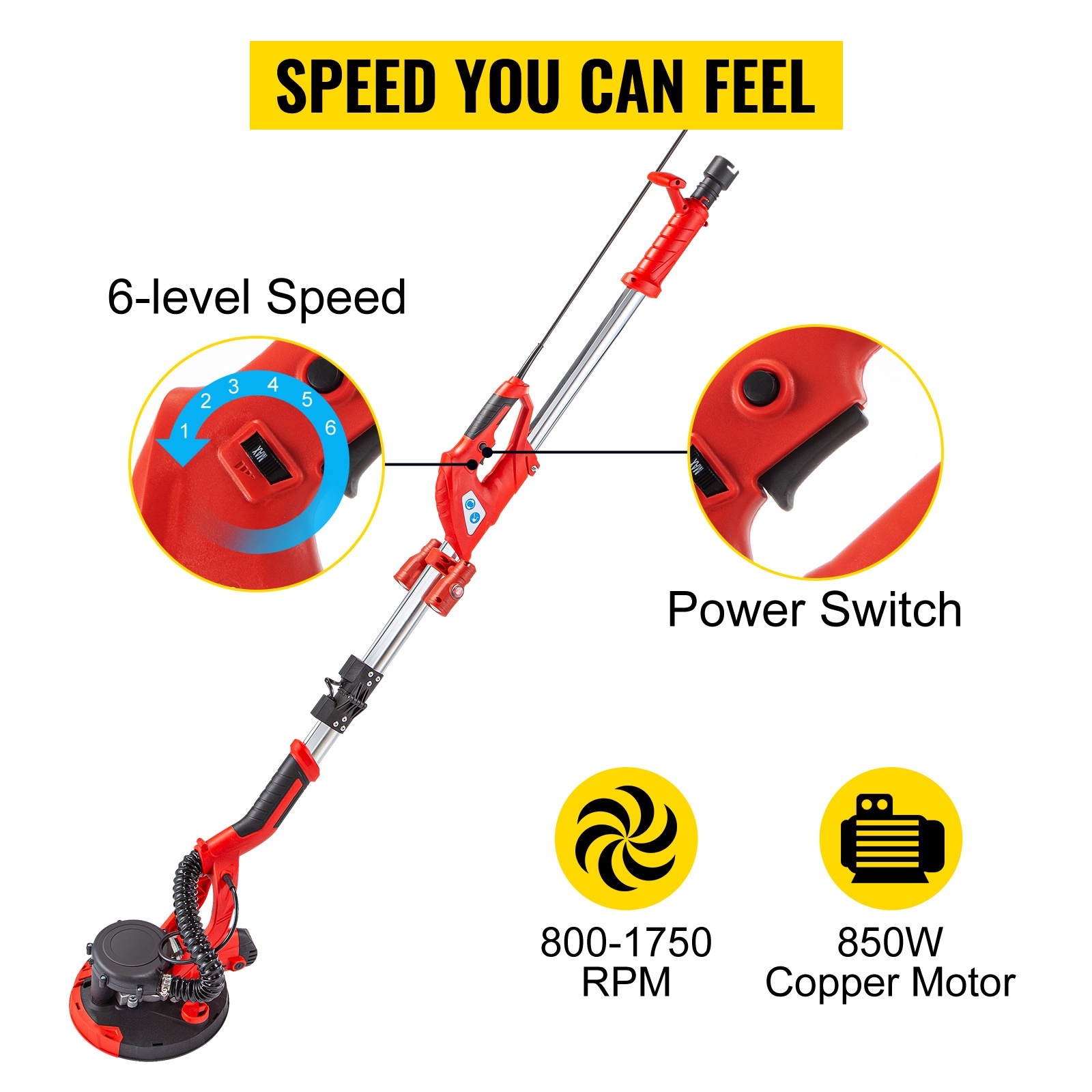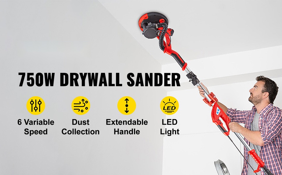 Sähköinen seinä- ja kattahiomakone 850 W säädettävä nopeus 800–1750 teleskooppivarrella pölynpoistolla