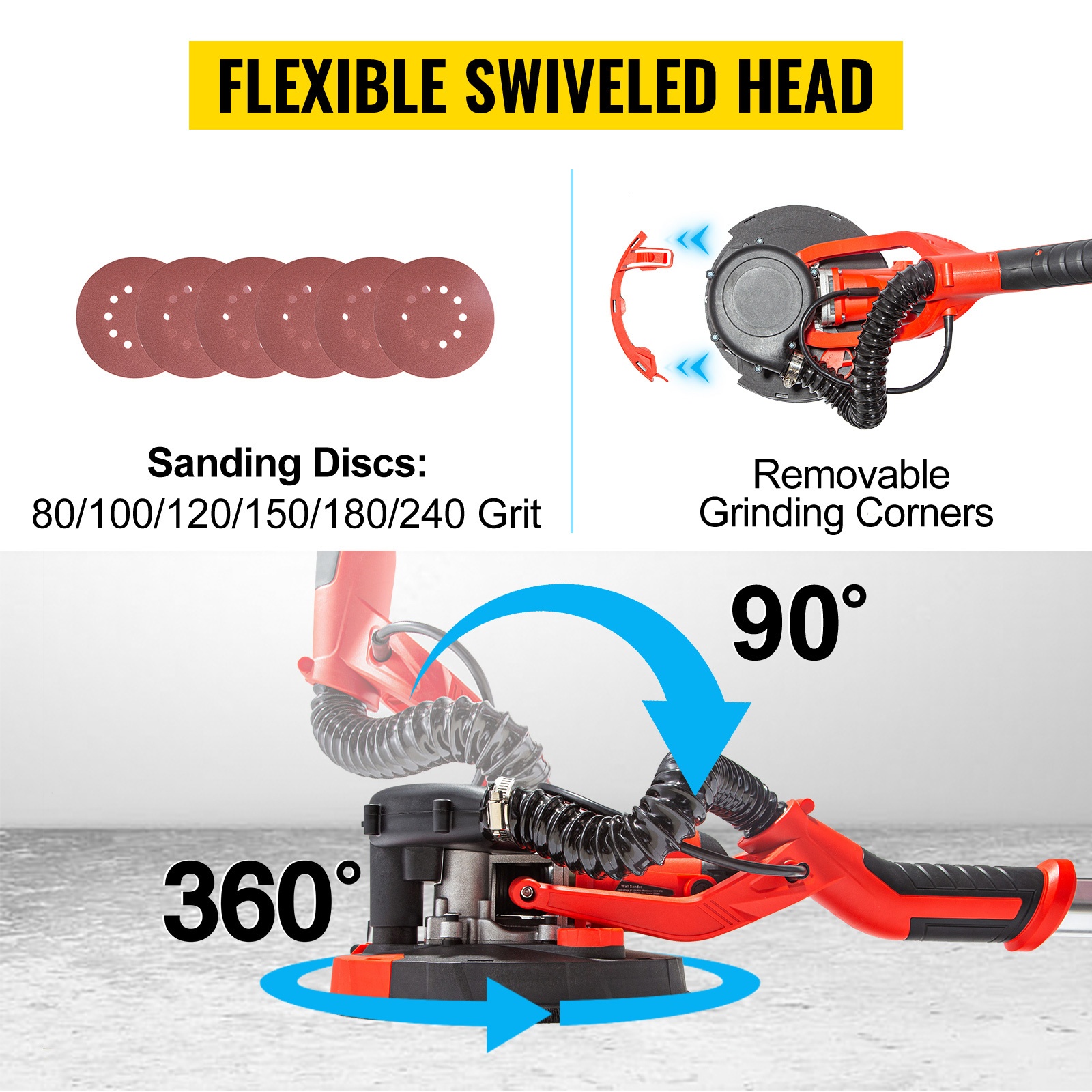 Hiomapää kääntyy pinnan mukaisesti, jolloin työskentely on sujuvaa myös epätasaisilla alueilla. Irrotettava kulmiosa helpottaa nurkkien ja seinänreunojen hiontaa. Hiomapaperin halkaisija on 8.86inch/225mm. Pakkaukseen sisältyy hiomapapereita kuudella eri karkeudella: 80/100/120/150/180/240.
