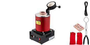 Pakkaukseen kuuluu sulatusuuni, 3 kg upokas, harkkomuotti, upokaspihdit, lämpösuojakäsineet, virtajohto ja käyttöohje.