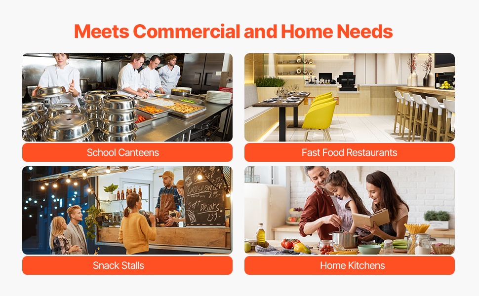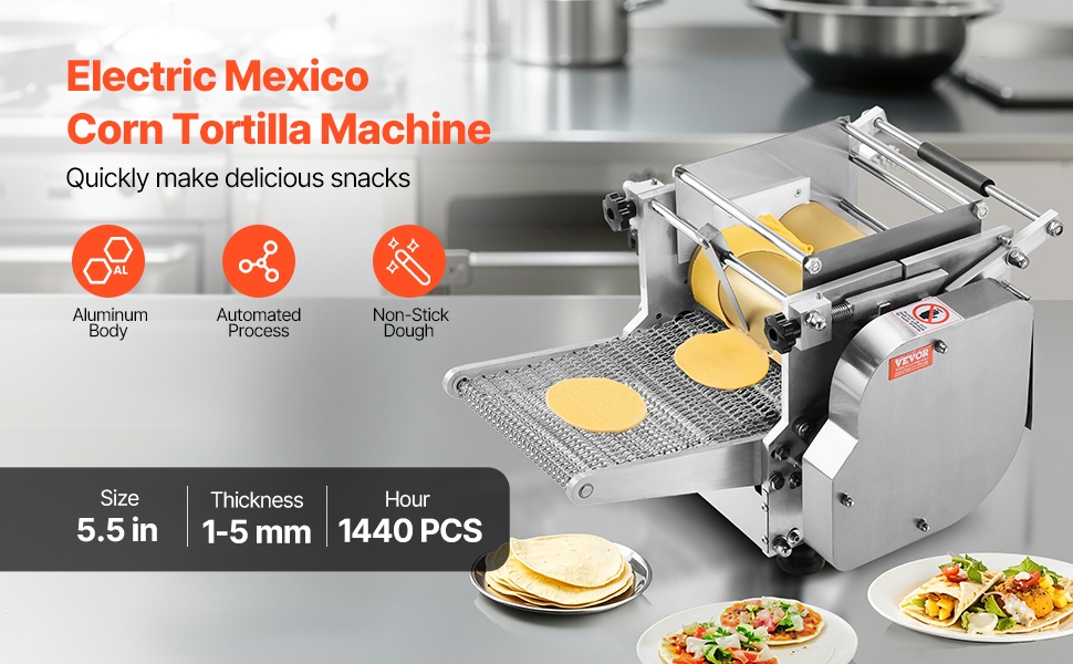 Rullien halkaisija on 4.7 in / 120 mm, ja mukana on kaksi eri muottikokoa: 4-tuumaiset ja 6-tuumaiset tortillat. Paksuutta voi säätää välillä 1–5 mm, joten saat tarpeen mukaan ohuet tai hieman paksummat tortillat esimerkiksi tacoihin, quesadilloihin tai muihin ruokiin. Laite sopii hyvin kotiin, ruokarekkoihin, ravintoloihin ja ruokaloihin.