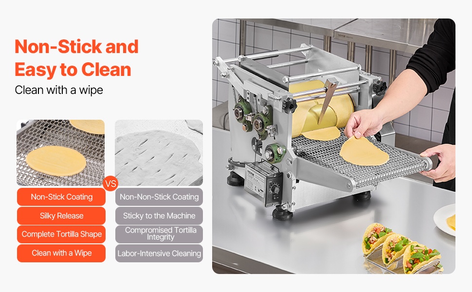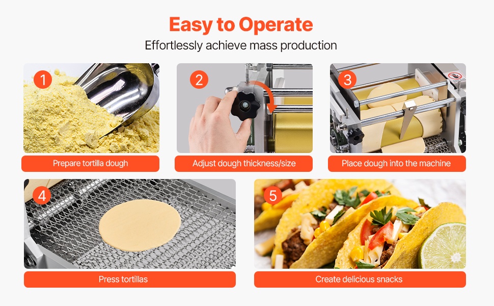 Käyttö on yksinkertaista: maissitaikina syötetään yläosan rullien sisään, minkä jälkeen kone puristaa sen automaattisesti tasaisiksi, pyöreiksi tortilloiksi. Suuri tuotantonopeus tekee laitteesta hyvän valinnan, kun tarvitaan tasalaatuista ja nopeaa valmistusta suurillekin määrille.