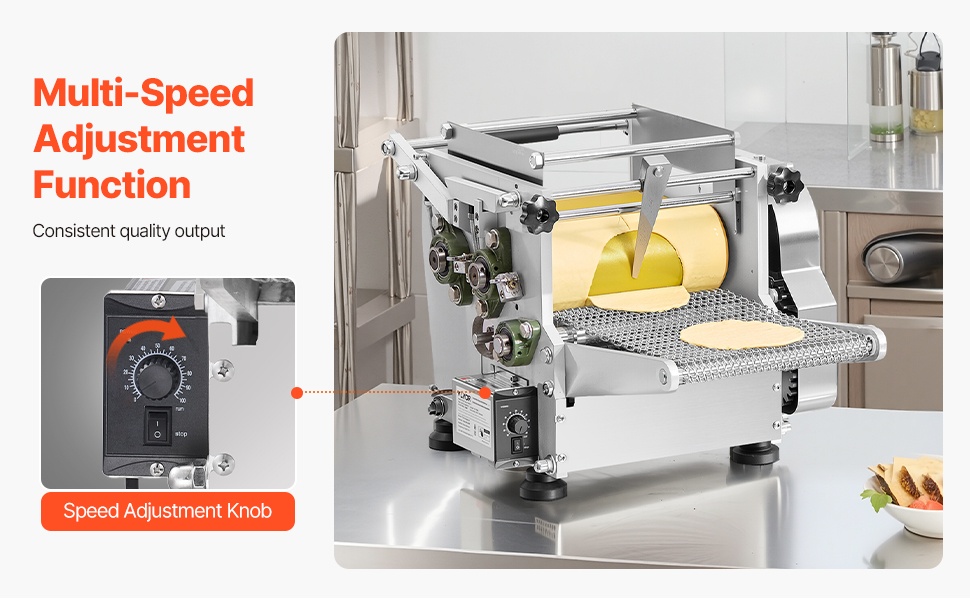 Sivussa oleva säätönuppi mahdollistaa rullien nopeuden helpon säätämisen. Näin voit mukauttaa tuotantovauhtia tilanteen mukaan ja varmistaa tasaisen paksuiset ja hyvin muotoutuneet tortillat – hyödyllistä erityisesti ammattikeittiöissä ja ruokaloissa.