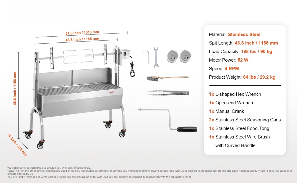 Vartasgrilli kestää jopa 89.8 kg kuorman, joten sillä voi paistaa kokonaisia sikoja, lampaita tai muita suuria paistoksia. Tilava rakenne ja yhteensopivat ritilät tarjoavat runsaasti kypsennystilaa.