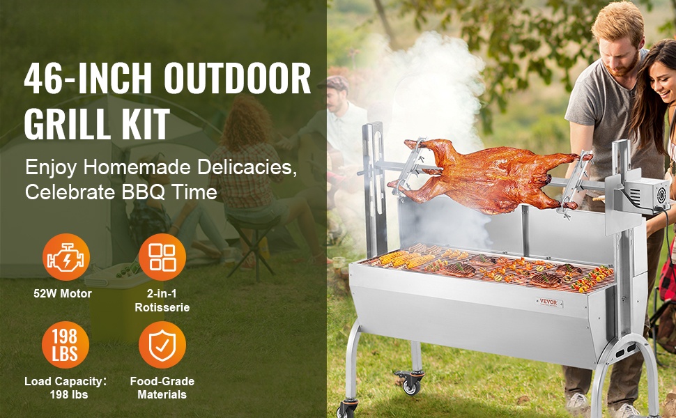 Monikäyttöinen sähköinen vartasgrilli puulle ja hiilille. Sopii kokonaisen porsaan, lampaan, kanan, kalkkunan ja muiden suurten lihapalojen kypsentämiseen tasaisesti pyörivällä vartaan avulla.