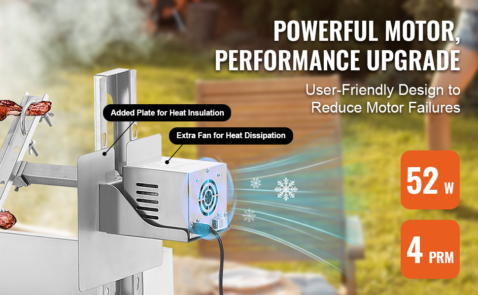 52W sähkömoottori pyörittää vartta tasaisesti nopeudella 4 RPM ilman raskasta käsityötä. Mukana tuleva lämpöeristyslevy ja tuuletin parantavat käyttömukavuutta ja suojaavat laitetta kuumuudelta.