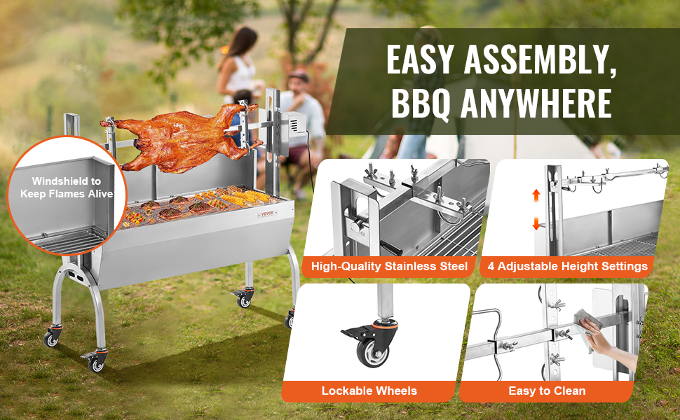 Sopii kinkun, rintapalan, kokonaisten kanojen, kalkkunoiden, porsaiden, vuohien ja lampaiden paistamiseen. Käytettävissä kotipihoilla, lomakeskuksissa, BBQ-baareissa, ravintoloissa ja leirintäalueilla erilaisilla alustoilla.