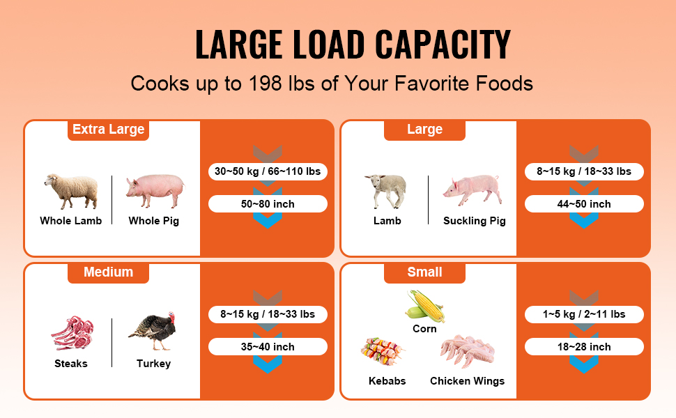 Grillin vartas kestää kuormituksen jopa (89,8 kg), joten se soveltuu kokonaisiin porsaisiin, lampaisiin, kanoihin ja muihin suurten lihapalojen paistamiseen.