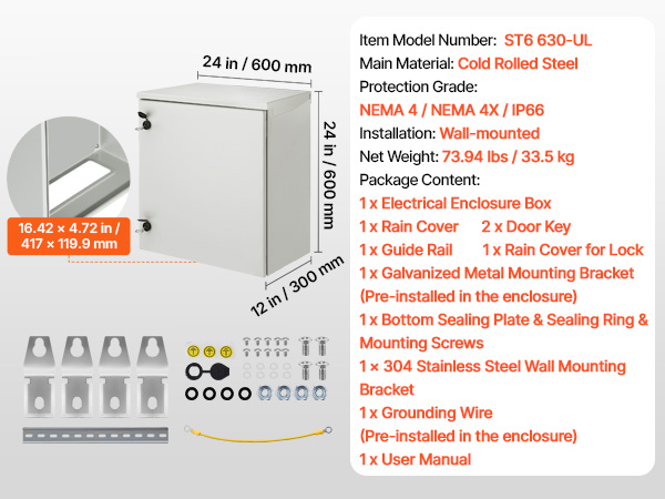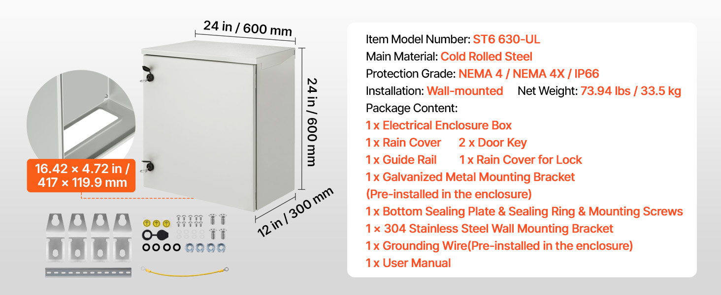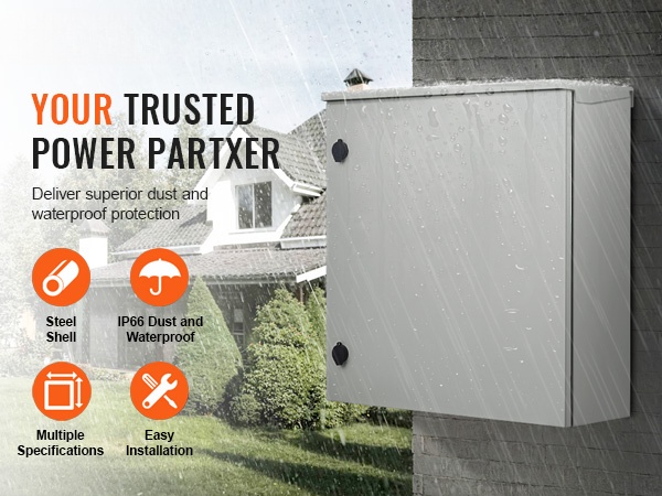 Kestävä teräksinen sähkökaappi on suunniteltu suojaamaan sähkölaitteitasi sekä sisä- että ulkokäytössä sääolosuhteet huomioiden. Kylmävalssatusta teräksestä valmistettu kotelo tarjoaa IP66-suojaustason, NEMA 4/NEMA 4X -luokituksen sekä tukevan seinäkiinnityksen. Koko on 60x60x30 cm, joten kaapissa on hyvin tilaa ohjaus- ja jakelulaitteille.