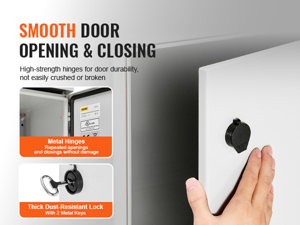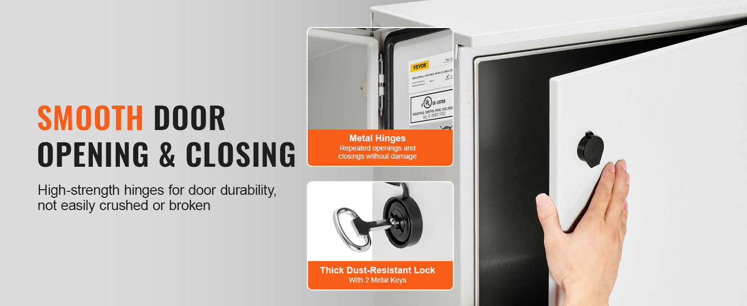 Ovi on saranoitu 304-ruostumattomasta teräksestä valmistetuilla saranoilla, jotka mahdollistavat sujuvan avauksen ja sulkemisen. Pölytiivis lukko auttaa pitämään lian poissa ja suojaa kaapin sisällä olevia komponentteja luvattomalta käsittelyltä.