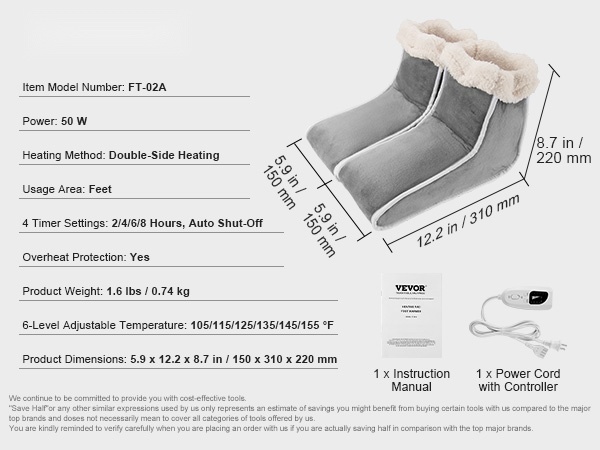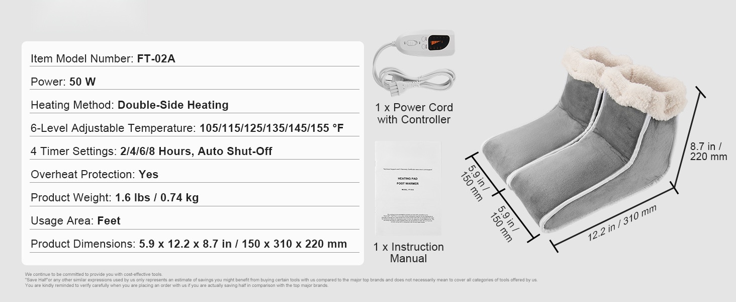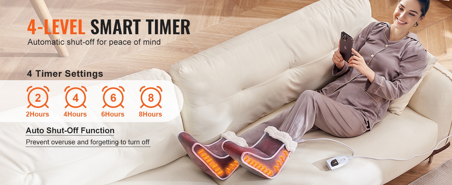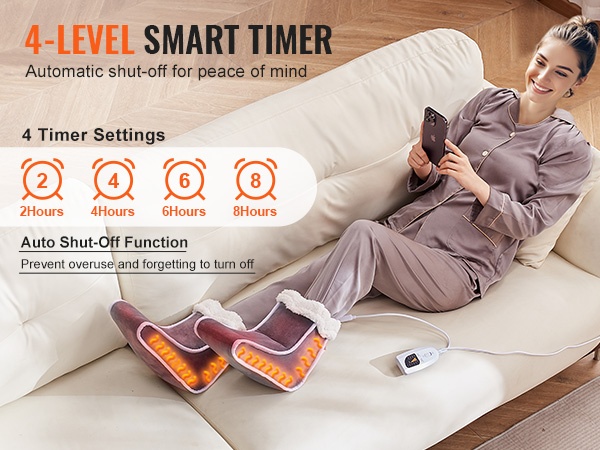 Sähkökäyttöisessä jalkalämmittimessä on 4-portainen älyajastin, jossa on valittavissa 30, 60, 90 tai 120 minuuttia. Automaattinen sammutus ehkäisee ylikäyttöä ja unohtamista, ja sisäänrakennettu ylikuumenemissuoja lisää turvallisuutta ja käyttömukavuutta.