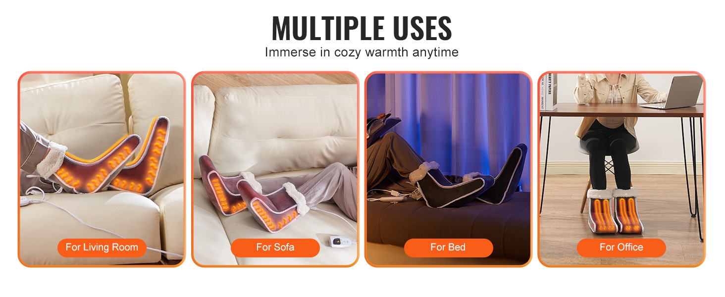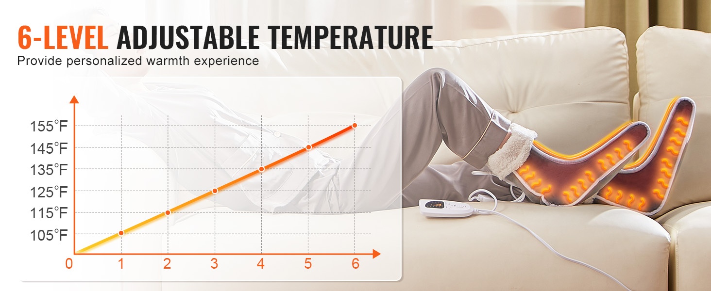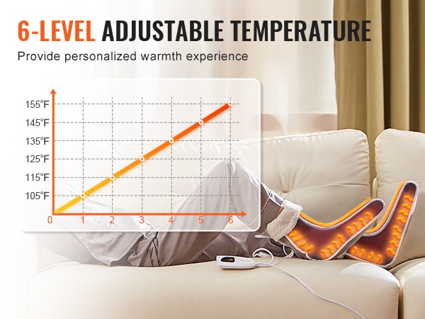 Sängylle tai toimistoon sopivassa jalkalämmittimessä on 6 lämmitystasoa, välillä 105 °F–155 °F, joten löydät helposti itsellesi miellyttävän lämpötilan. Kätevällä ohjaimella säädät asetuksia vaivattomasti tilanteen ja mieltymysten mukaan.