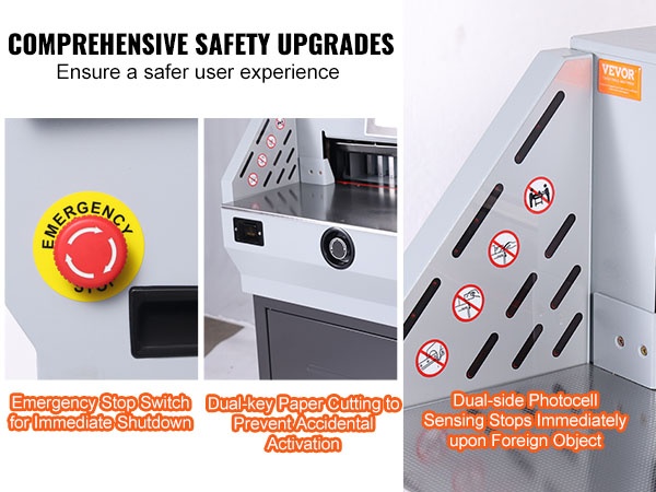 Turvallisuus on huomioitu laitteen suunnittelussa. Leikkuualuetta ympäröivät infrapuna-anturit pysäyttävät laitteen, jos valonsäde katkeaa esimerkiksi käden tai vieraan esineen vuoksi. Kaksipainikkeinen käynnistys estää tahattomat käynnistykset, ja hätäpysäytyspainike mahdollistaa laitteen nopean sammutuksen poikkeustilanteissa.