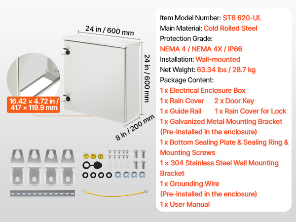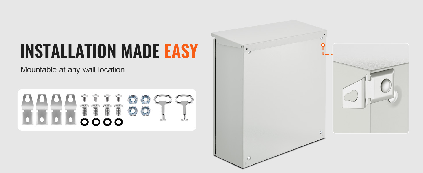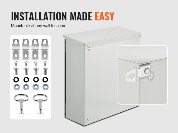 Jokaisen kotelon mukana toimitetaan kaksi metallista avainta sähköjärjestelmän suojaamiseksi luvattomalta käytöltä. 304-ruostumattomasta teräksestä valmistettu kiinnitysteline mahdollistaa vakaan seinäasennuksen.