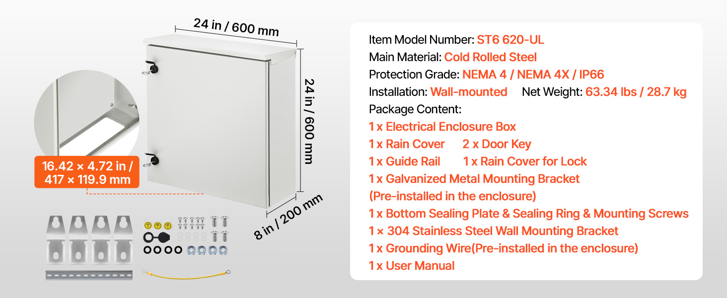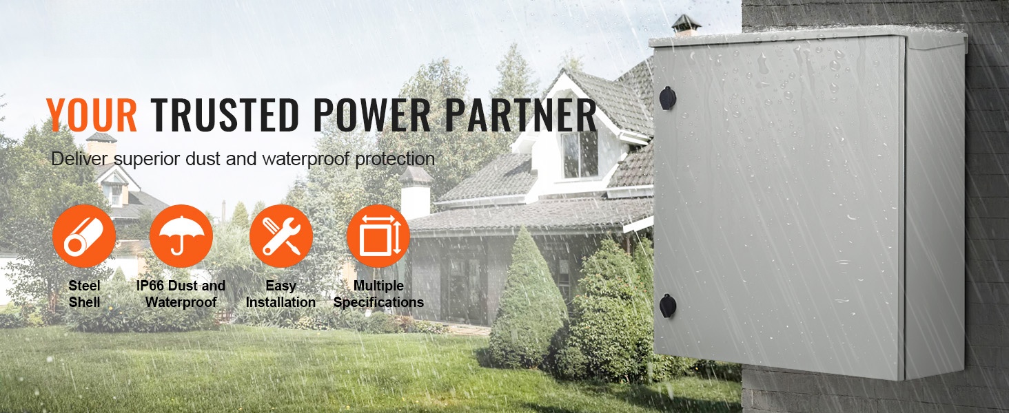 Kotelo on valmistettu 2.0 mm paksusta kylmävalssatusta teräksestä, mikä edistää pitkää käyttöikää ja korroosiosuojaa sekä sisä- että ulkokäytössä. Käyttöikä ja kestävyys riippuvat käyttöympäristöstä ja sääaltistuksesta. NEMA 4 / NEMA 4X / IP66 -luokituksen ansiosta sähkölaitteesi ovat suojassa roiskevedeltä, sateelta, pölyltä ja lialta.