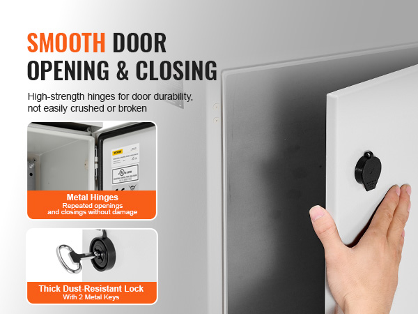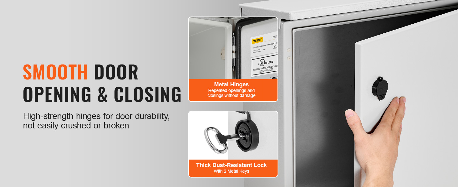 Oven 304-ruostumattomasta teräksestä valmistetut saranat tekevät avaamisesta ja sulkemisesta sujuvaa. Pölytiivis lukko estää lian pääsyn sisälle ja suojaa asennettuja komponentteja.