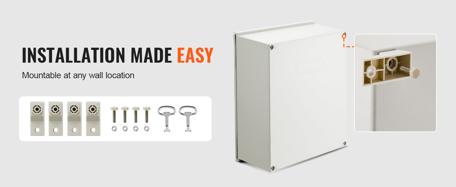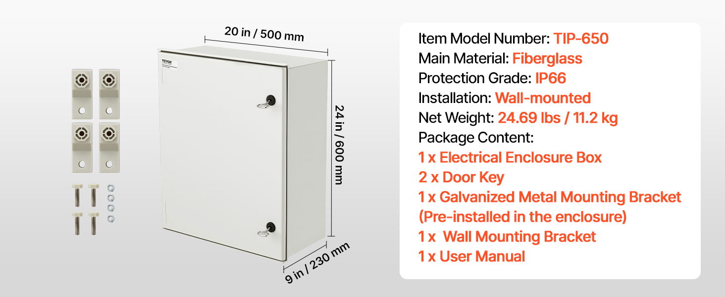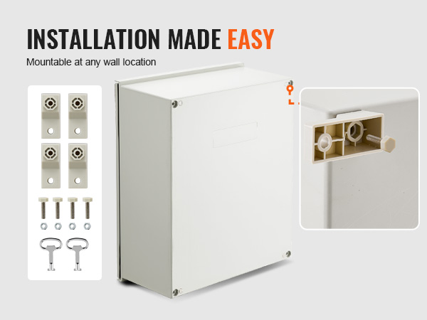 Kotelon mitat ovat 60 cm × 50 cm × 23 cm, ja se on tarkoitettu seinäkiinnitykseen. Mukana toimitetaan kiinnityslevy ja kiinnitystarvikkeet.