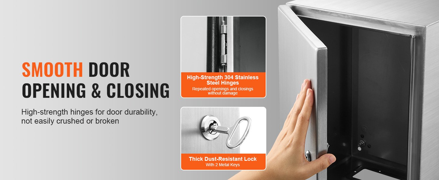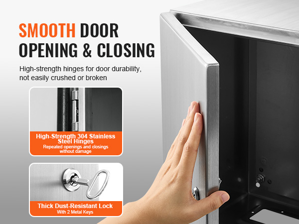 Ovi on saranoitu 304-ruostumattomasta teräksestä tehdyillä saranamekanismeilla, jotka mahdollistavat sujuvan avauksen ja sulkemisen. Paksunnettu, pölytiivis lukko auttaa pitämään pölyn poissa ja suojaa sisällä olevia laitteita.