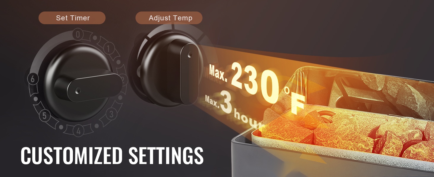 Enintään 230℉ / 110℃ lämpötila ja 3 h maksimiaika-asetus antavat joustavuutta ja hallittavuutta saunaelämykseen, jotta voit säätää lämmön ja ajan omien mieltymystesi mukaan.