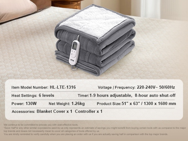 Ajastin on säädettävissä 1–9 tunnin välillä, ja viltti sammuu automaattisesti 8 tunnin kuluttua.