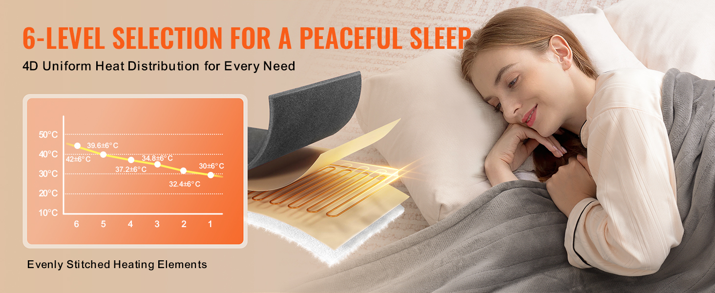 Yhtenäisen lämmitysjärjestelmän ansiosta jopa 80 % peitosta lämpenee tasaisesti. Voit valita miellyttävän lämpötilan 6 eri lämpöasetuksesta.