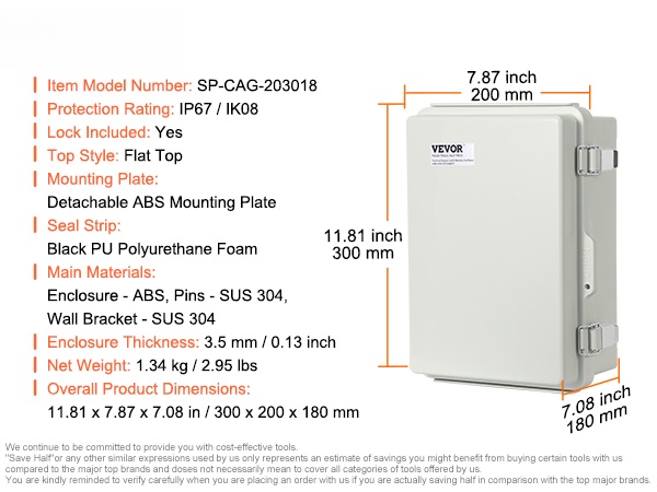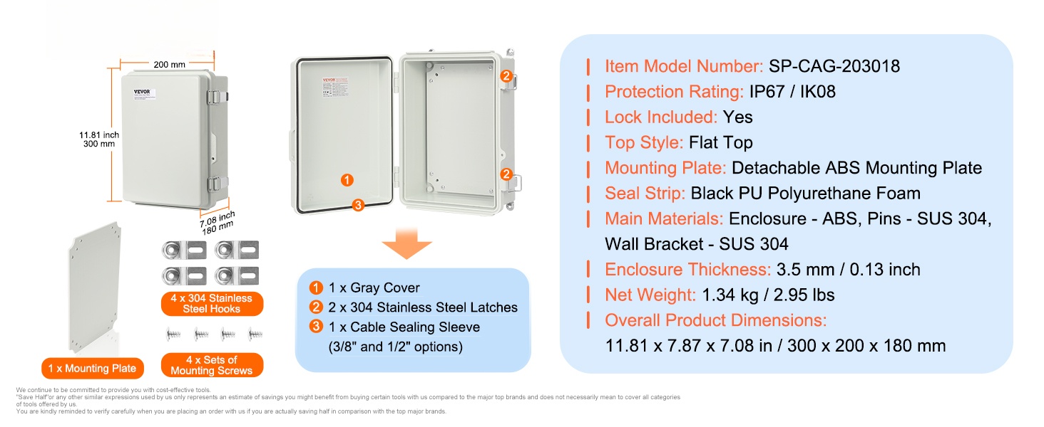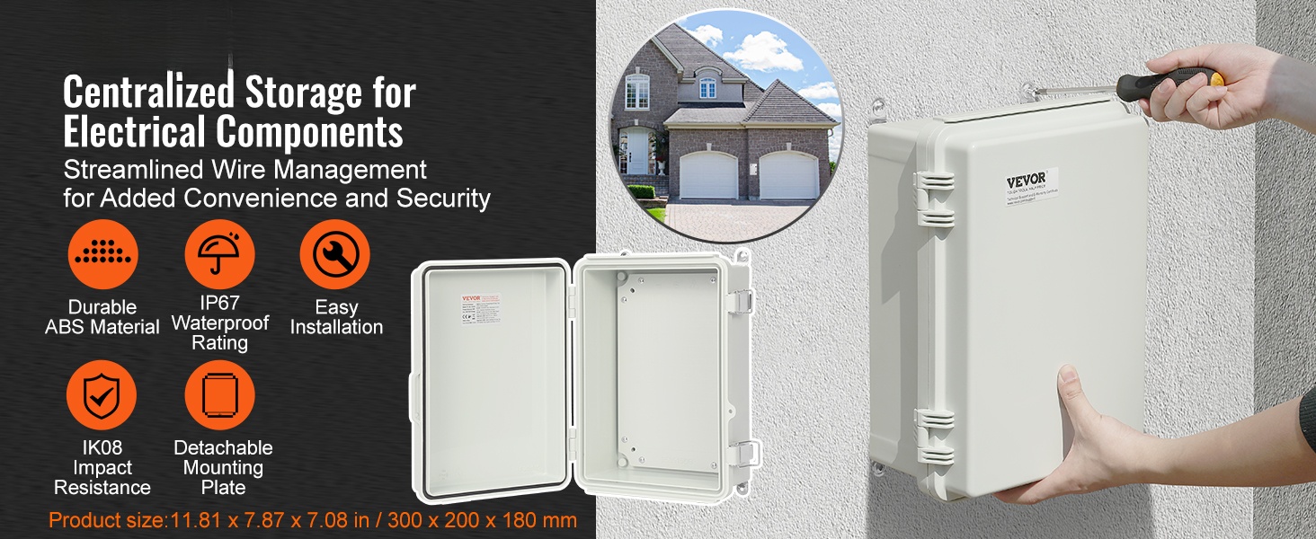 ABS-jakorasian ulkomitat ovat 300 x 200 x 180 mm ja sisämitat 268 x 168 x 156 mm, joten tilaa riittää kaapeleille, liittimille ja laitteille. Kotelon tasainen kansi helpottaa asennusten suunnittelua ja läpivientien sijoittelua.