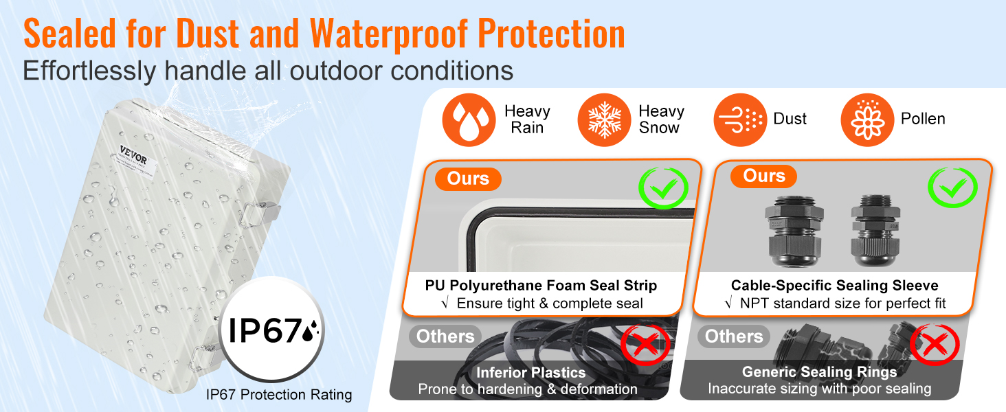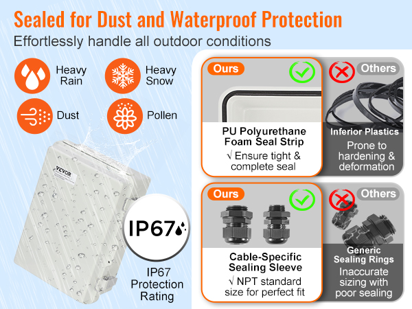 Kotelossa käytetään laadukasta PU-polyuretaanivaahtotiivistettä, jonka ansiosta saavutetaan pölytiiviysluokka IP6 ja vesitiiviysluokka IP7. Näin kotelo tarjoaa IP67-tasoisen suojauksen ja auttaa pitämään sähkölaitteet toimintakunnossa sateessa, roiskeissa ja muissa vaativissa ulko-olosuhteissa.