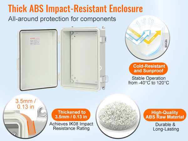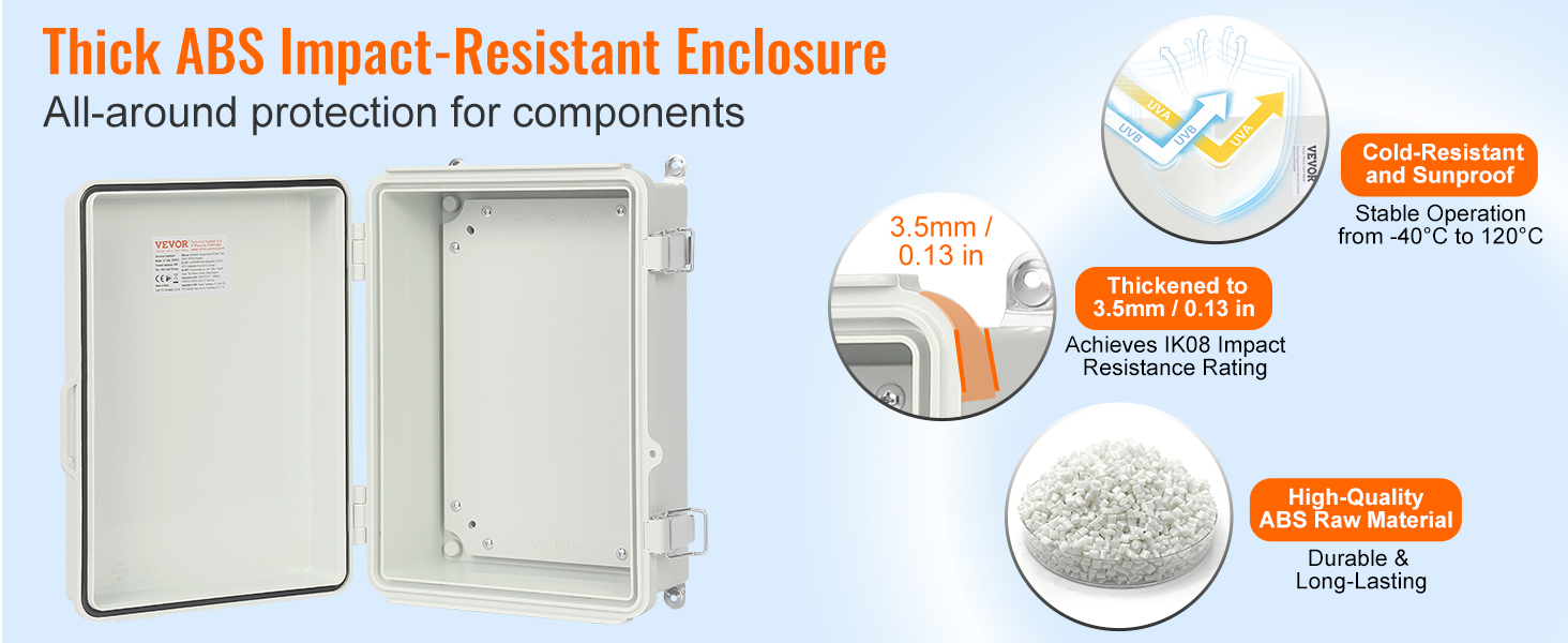 Runko on vahvistettua 3,5 mm ABS‑muovia, ja se täyttää IK08‑iskunkestävyyden, kestäen 2,5 kg iskua ilman sisäosien vaurioitumista.