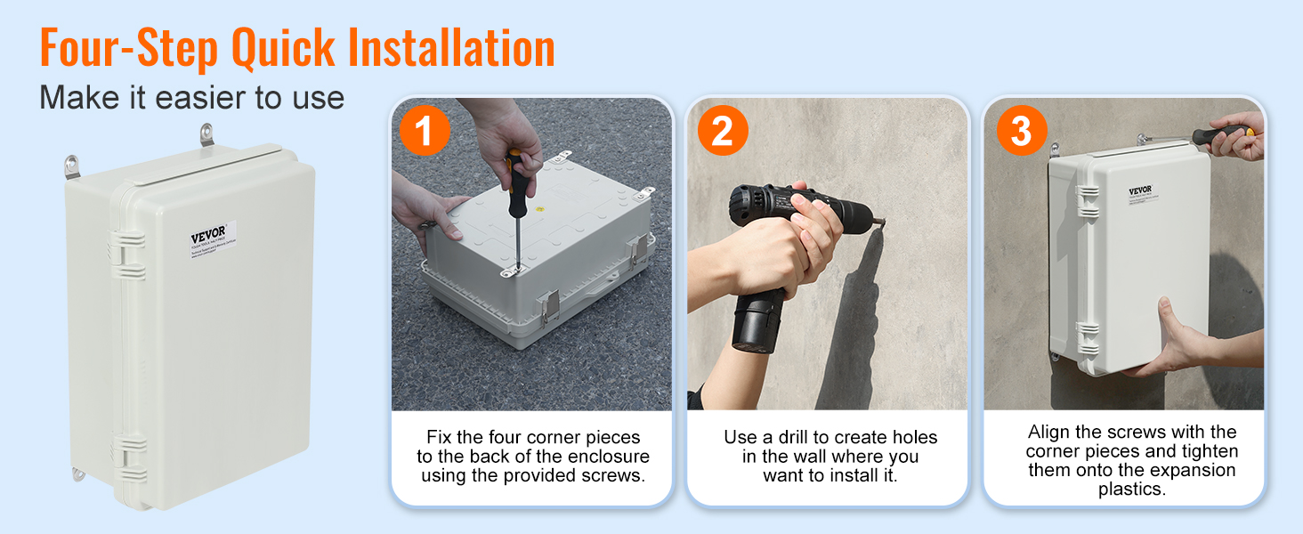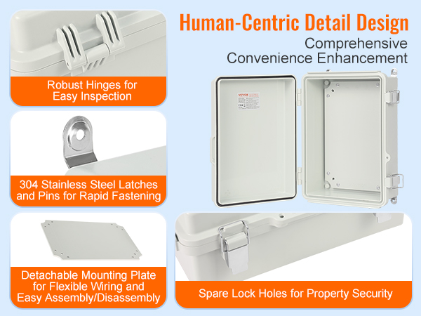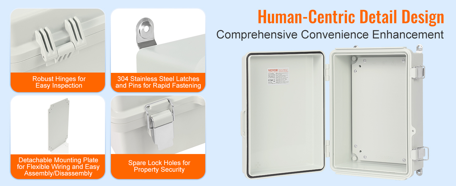 Kansissa on saranoitu rakenne ja 304-ruostumattomasta teräksestä valmistettu salpa, joten kotelon avaaminen tarkastuksia ja huoltoa varten on nopeaa ja vaivatonta. Mukana tuleva irrotettava kiinnityslevy helpottaa komponenttien kiinnittämistä ja myöhempiä muutoksia.