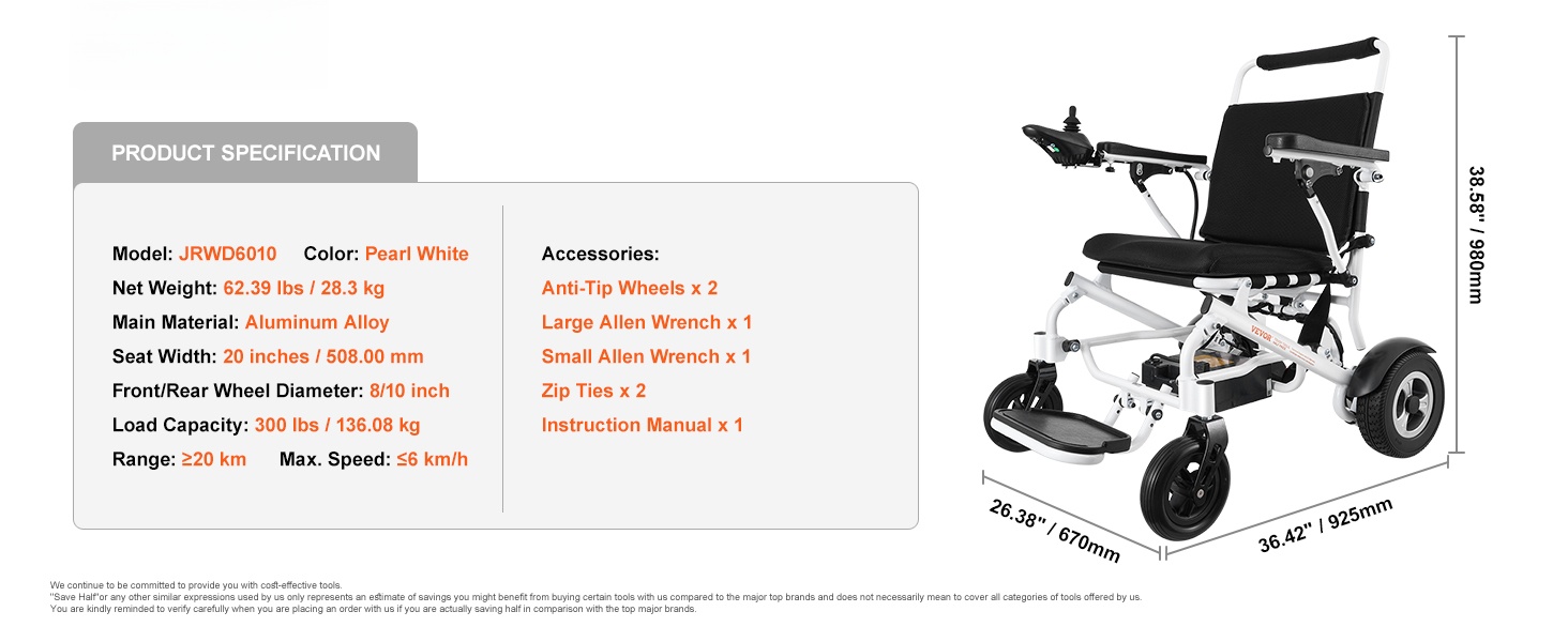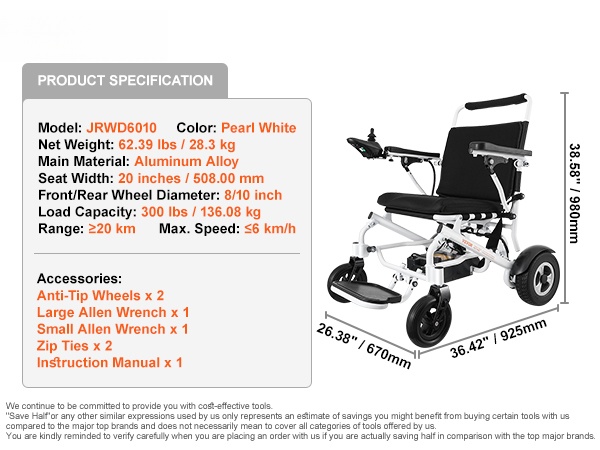 Sähköpyörätuoli taittuva JRWD6010 136 kg kantavuus 50,8 cm leveä istuin