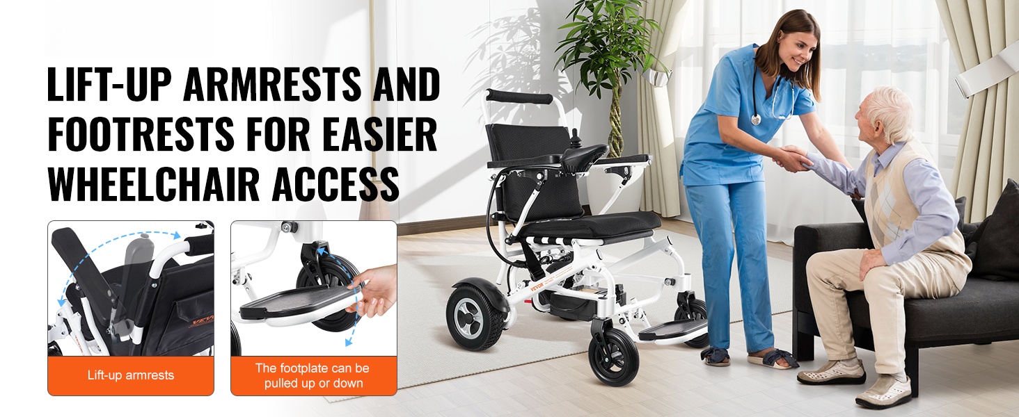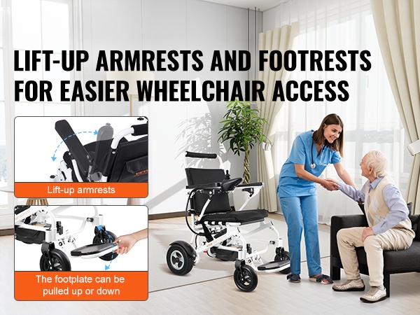 - Nostettavat käsinojat ja sivulle avautuvat jalkatuet helpottavat siirtymistä tuoliin ja siitä pois.