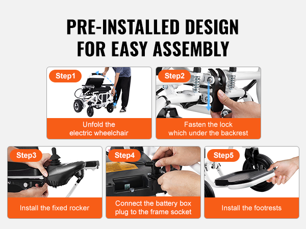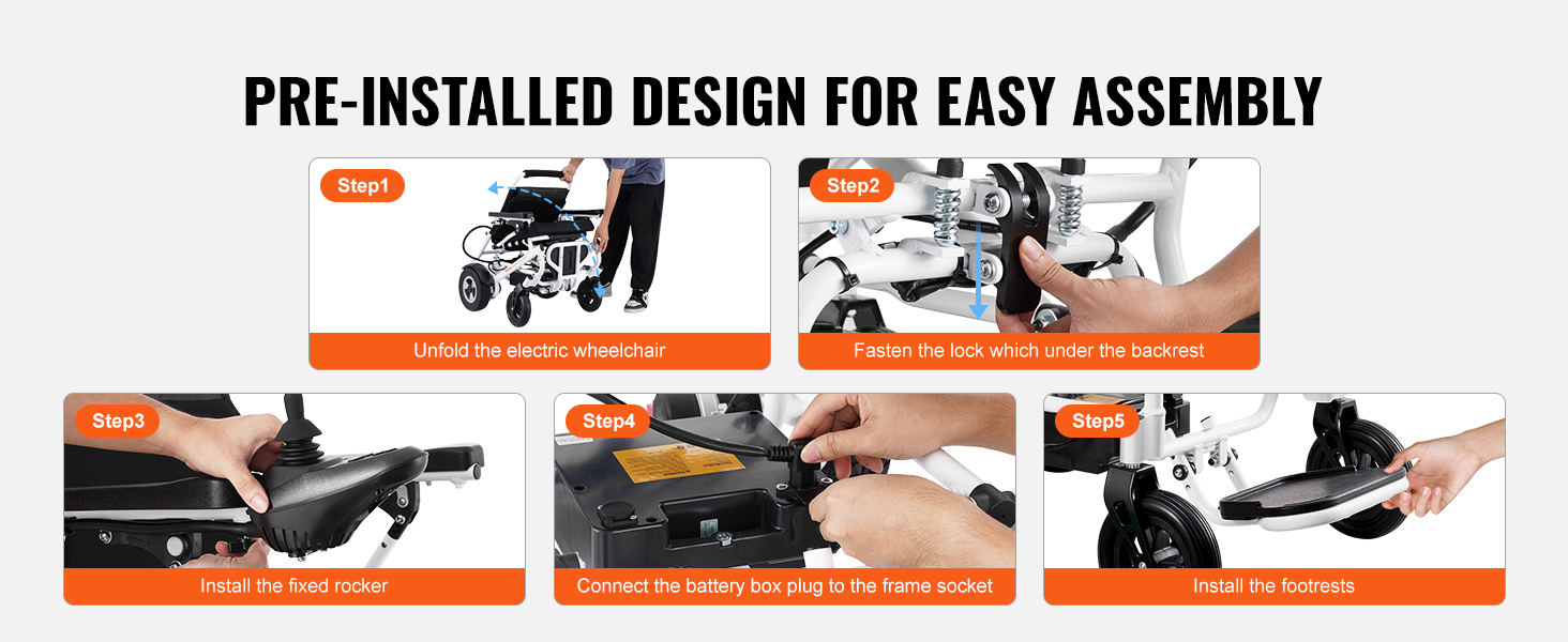 Sähköpyörätuoli on helppo asentaa, joten sen saa käyttövalmiiksi nopeasti ilman monimutkaista kokoamista. Vaiheet on helppo seurata, ja käyttöön pääsee nopeasti ilman ylimääräistä odottamista tai raskasta asennustyötä.