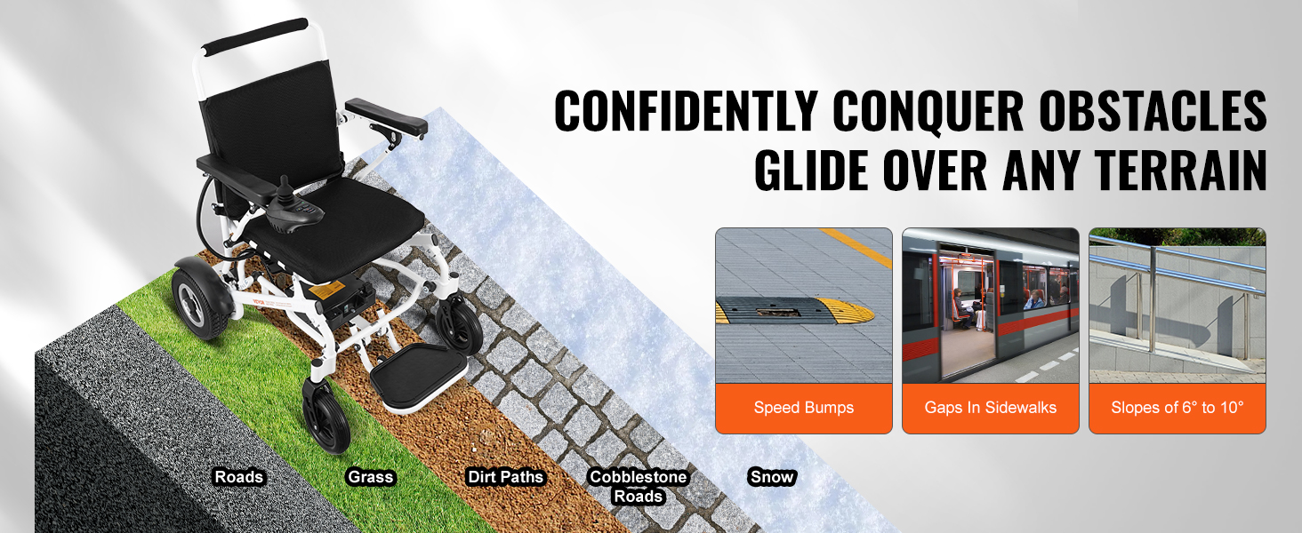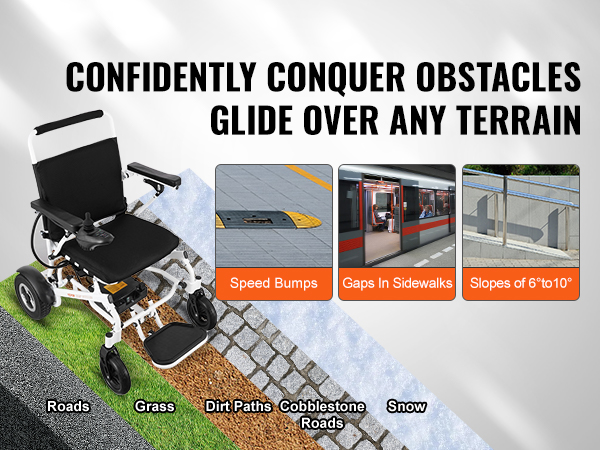 Pyörätuoli on suunniteltu selviytymään erilaisista esteistä ja pinnoista. Se soveltuu ajamiseen tiellä, nurmikolla, hiekkapoluilla ja mukulakivillä. Tuote soveltuu ulkokäyttöön sääolosuhteet huomioiden, ja talvikaudella suositellaan olosuhteiden mukaista suojausta tai säilytystä. Nopeuskorokkeet, metron raot ja noin 6–10° kaltevat pinnat sujuvat hallitusti, mikä helpottaa liikkumista arjessa ja matkoilla.