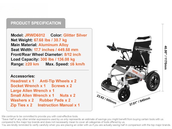 Sähköpyörätuoli taittuva JRWD6012, säädettävä selkänoja, kantavuus 136 kg, alumiiniseosrunko
