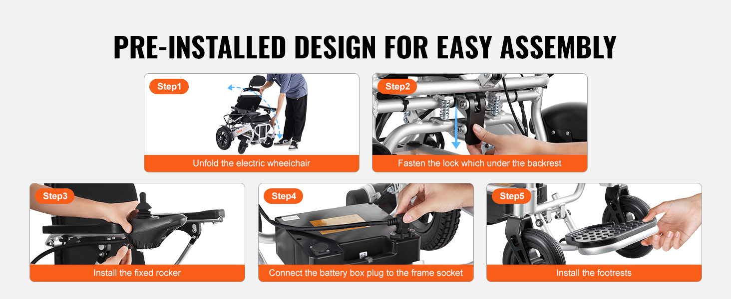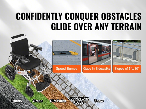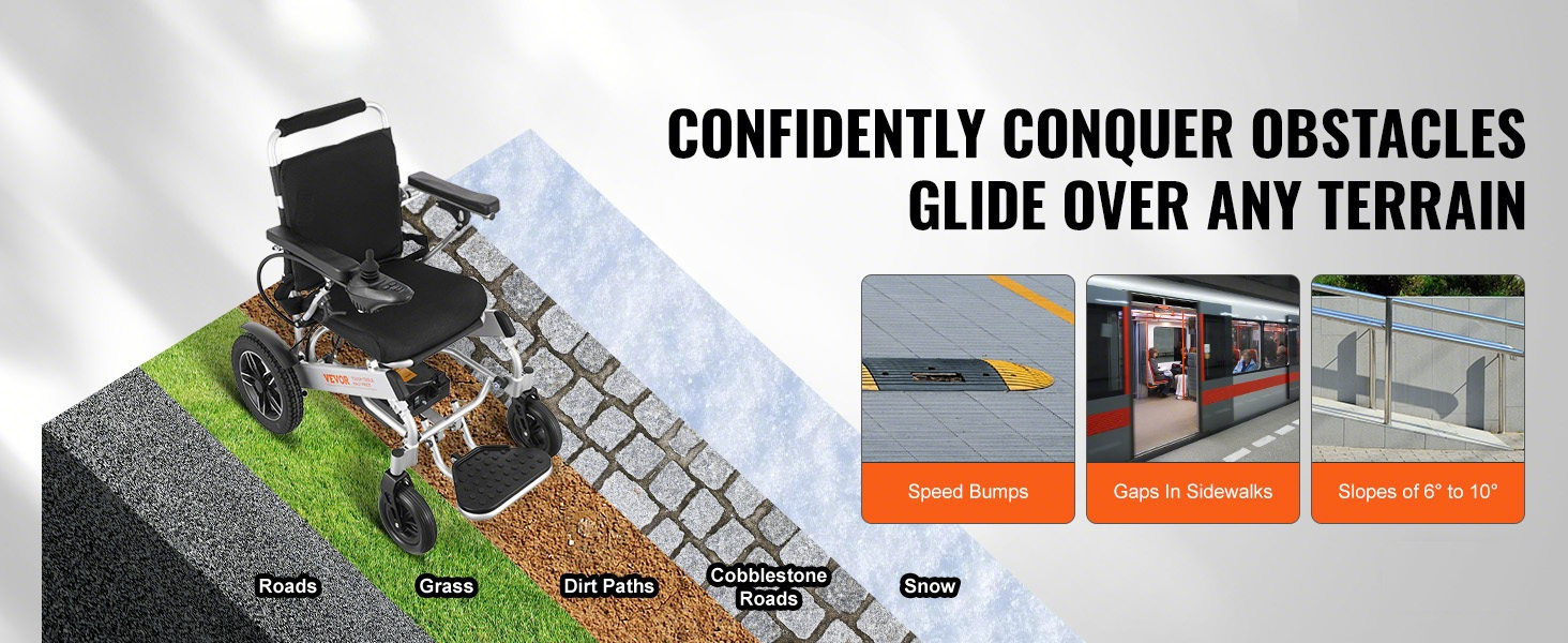 Tämä sähköpyörätuoli taittuu yhdellä painikkeella, mikä helpottaa sen sijoittamista auton tavaratilaan ja tekee matkustamisesta vaivattomampaa. Kiinteät, räjähdyssuojatut ja iskunvaimennetut renkaat sekä hyvä mäennousukyky suoriutuvat erilaisista alustoista sujuvasti.