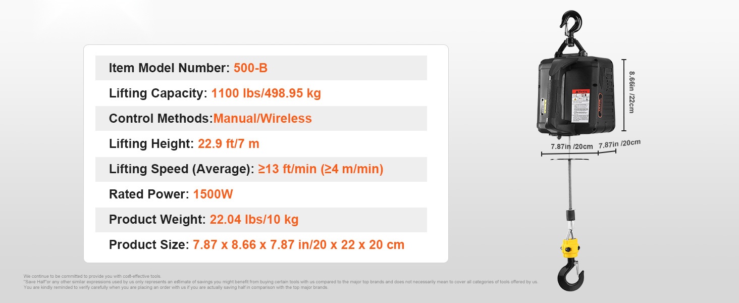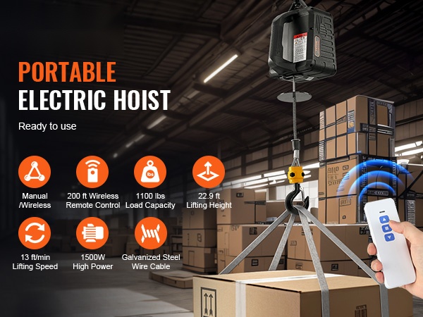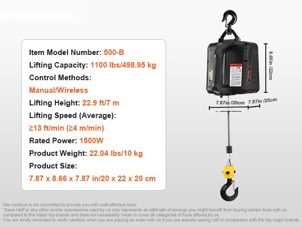 Sähkötalja 499 kg 1500 W kannettava kolme ohjaustapaa sinkitty teräsvaijeri 7 m