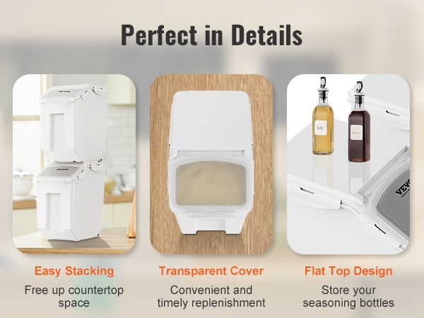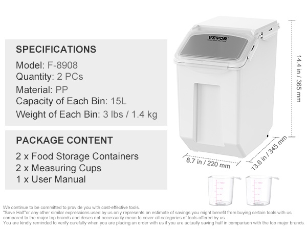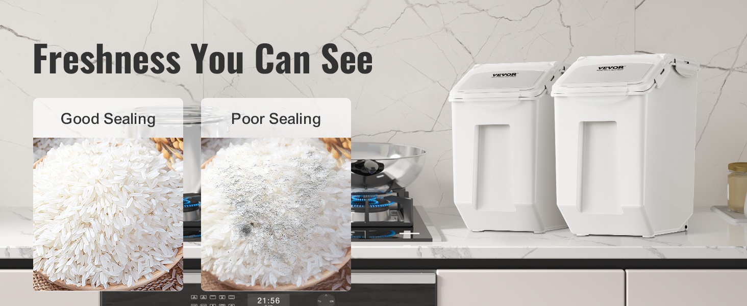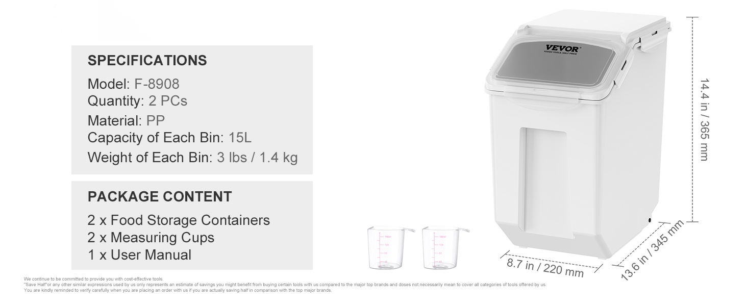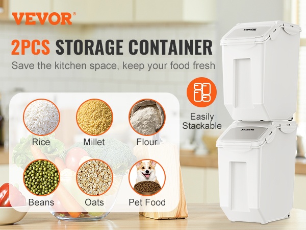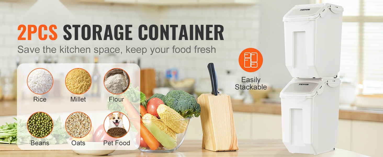 Näiden kahden 15L säilytysastian avulla pidät riisin, jauhot, viljat, pavut, pähkinät tai lemmikkien kuivaruoan järjestyksessä ja suojassa kosteudelta. Ilmatiiviit kannet ja pinottava muoto säästävät tilaa keittiössä tai varastossa.