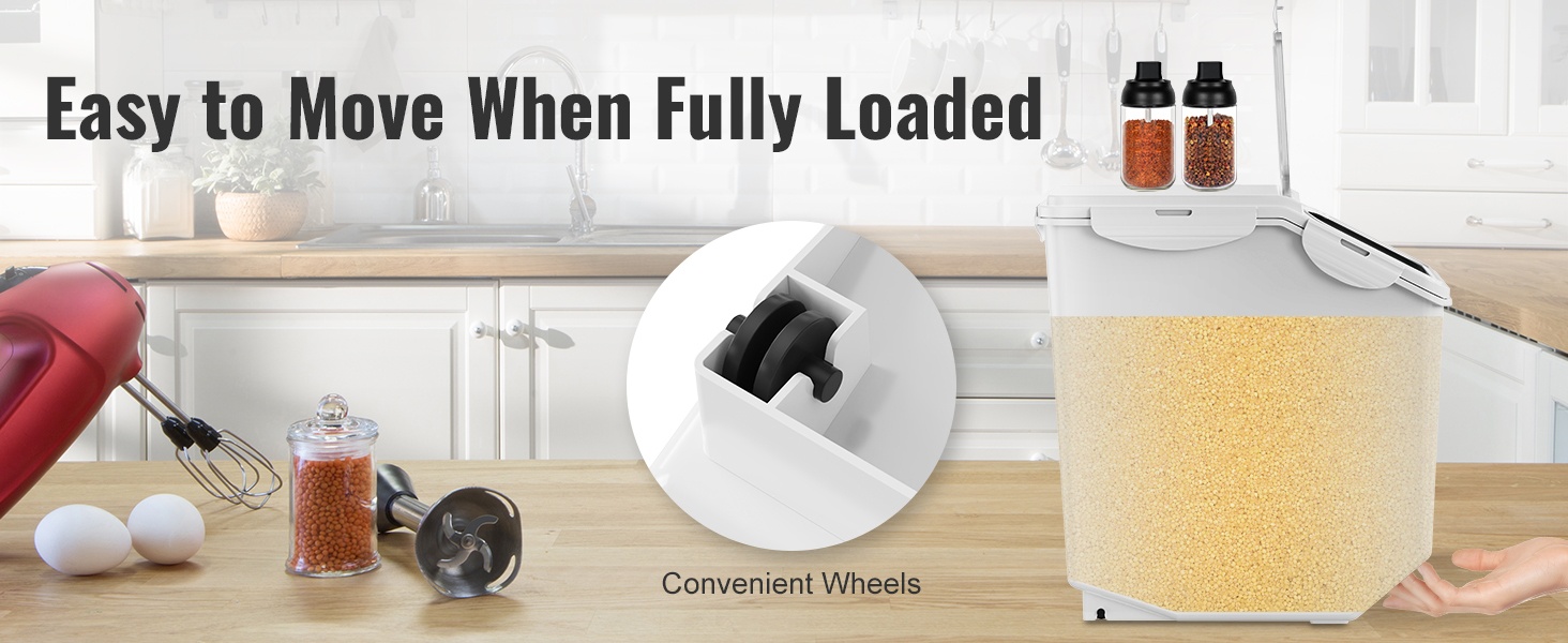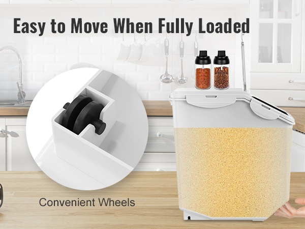 Astiassa on alapinnassa rullat, joiden ansiosta sitä on vaivaton siirtää, vaikka se olisi täynnä raskasta ruokaa tai viljaa.