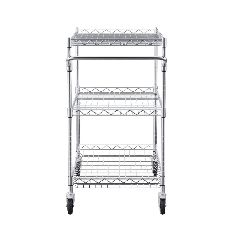 Tämä 3-tasoinen metallinen palvelu- ja säilytyskärry helpottaa tavaroiden siirtämistä ja järjestämistä keittiössä, toimistossa, varastossa tai ulkokäytössä. Syvät, verkkopohjaiset korihyllyt pitävät tavarat tukevasti paikallaan, ja teräsrakenne kestää raskastakin kuormitusta.