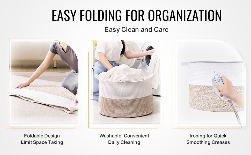 Kori voidaan taittaa kasaan, kun se ei ole käytössä, mikä säästää tilaa säilytyksessä. Kun korin ottaa jälleen käyttöön, se palautuu nopeasti vankkaan muotoonsa. Pestävissä oleva puuvillakangas helpottaa puhtaana pitämistä.
