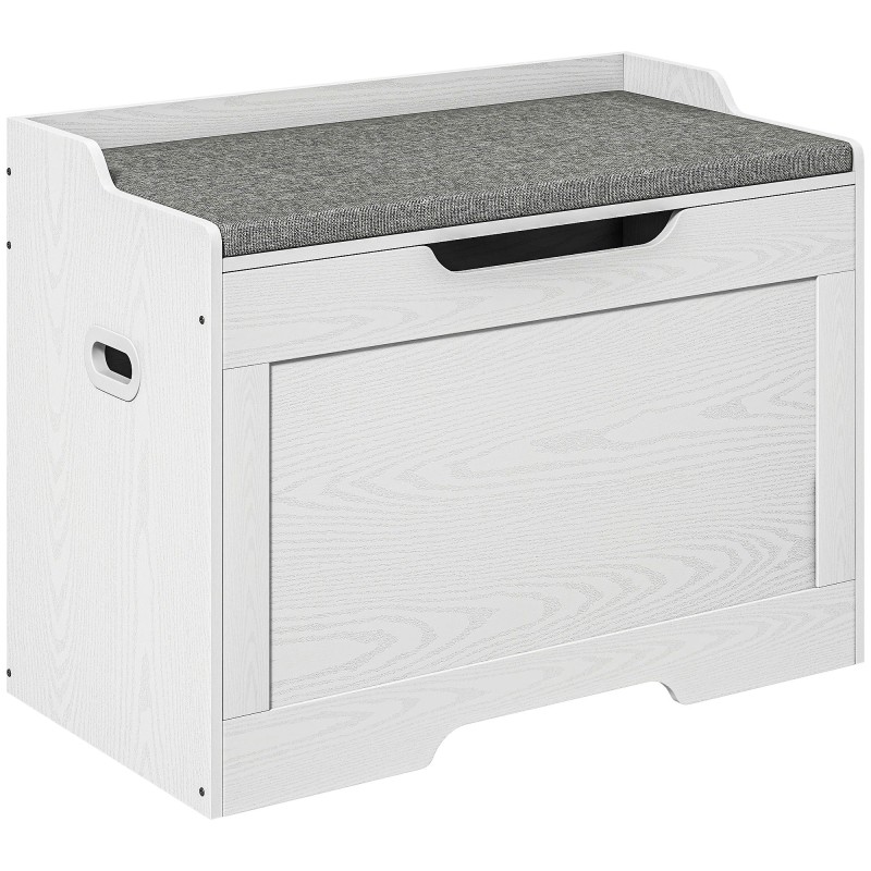Tämä valkoinen säilytys- ja istuinpenkki yhdistää käytännöllisen säilytystilan ja mukavan istumapaikan samaan kalusteeseen. 103 litran tilavuus kätkee sisäänsä runsaasti tavaraa, ja harmaa pehmustettu istuintyyny tekee penkistä miellyttävän käyttää niin eteisessä, makuuhuoneessa kuin olohuoneessakin.