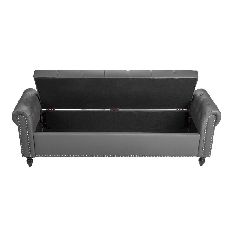 Tämä nappikoristeltu säilytysrahi yhdistää istuimen ja säilytystilan samaan kalusteeseen. Keinonahkaverhoilu, pyöristetyt käsinojat ja massiivipuiset jalat sopivat eteiseen, olohuoneeseen, makuuhuoneen sängynpäätyyn tai ruokailutilaan.