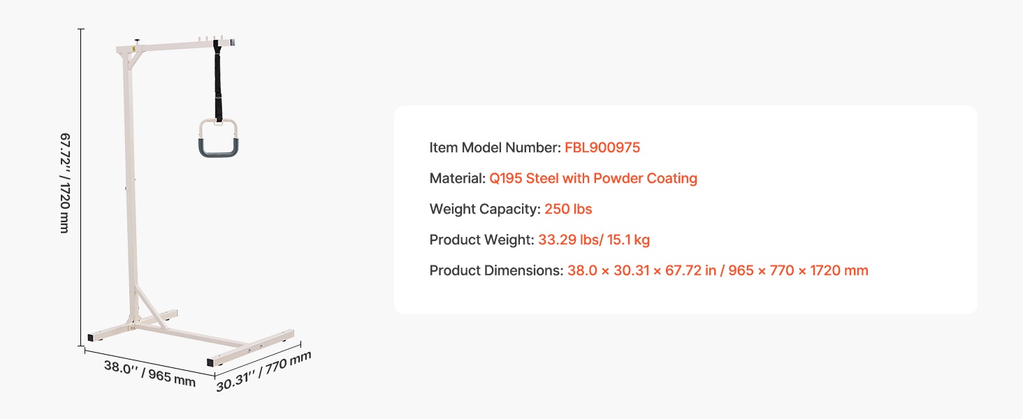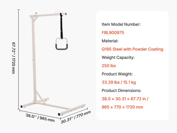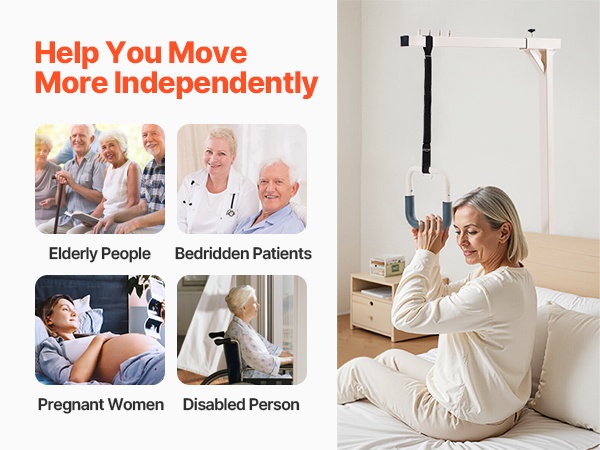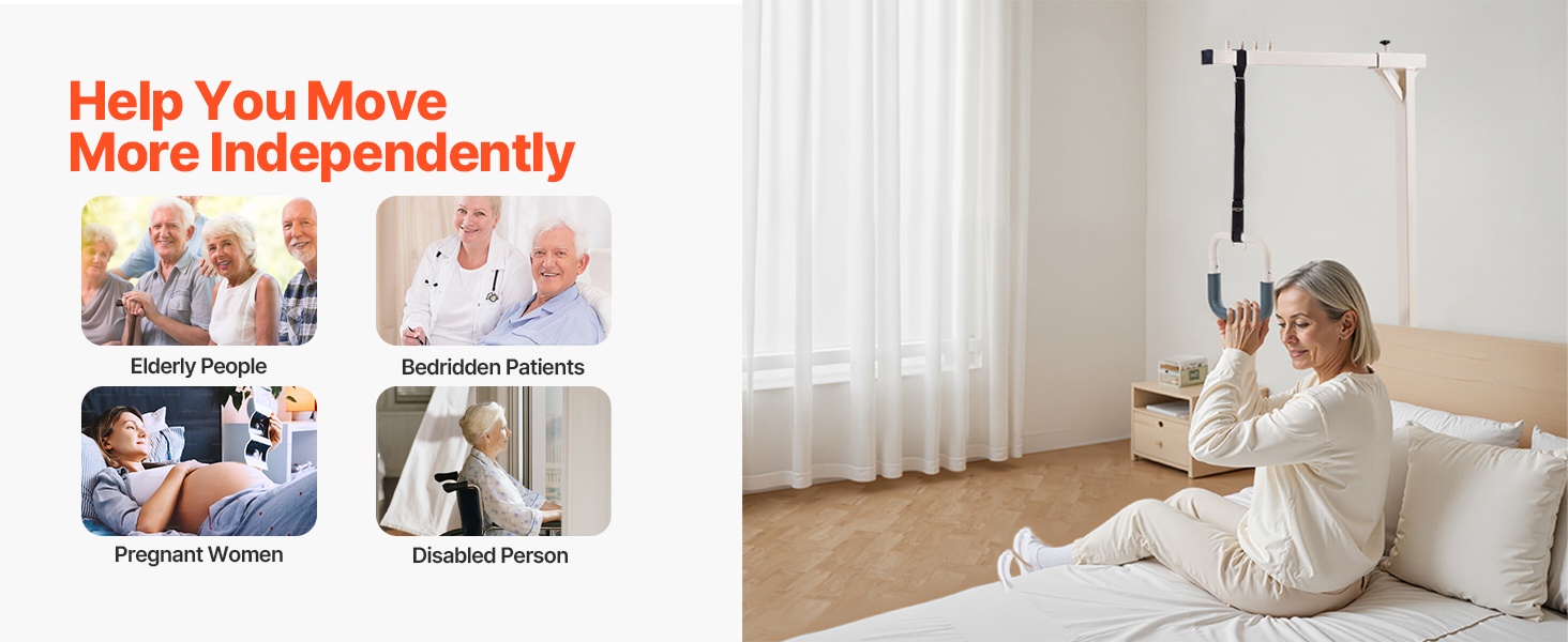 Tämä sängyn yläpuolinen trapetsitanko helpottaa liikkumista vuoteessa ja siitä pois. Se tarjoaa vakaan tuen istumaan nousuun, asennon vaihtamiseen ja siirtymiseen esimerkiksi pyörätuoliin. Sopii ikääntyneille, pitkäaikaispotilaille, raskaana oleville ja henkilöille, joilla on liikkumisrajoitteita kotona, sairaaloissa ja hoivakodeissa.
