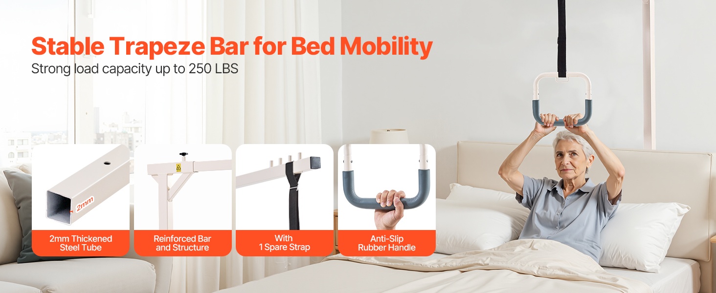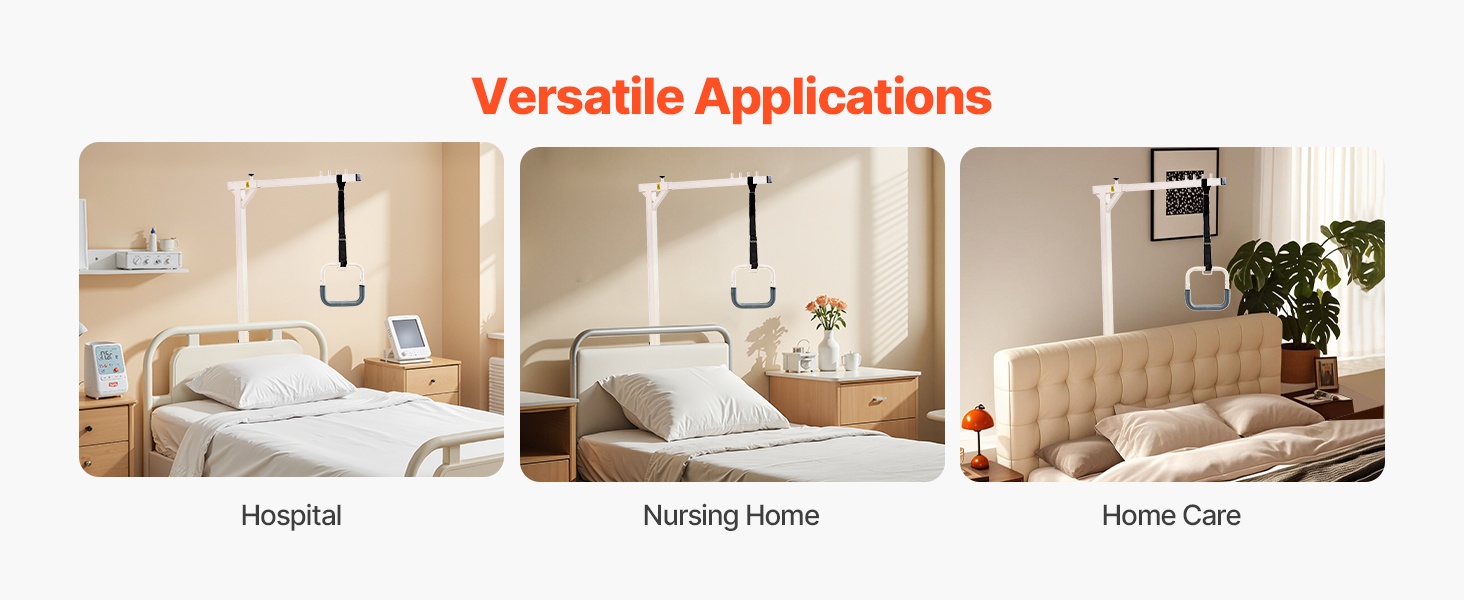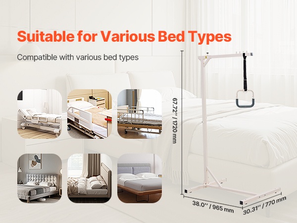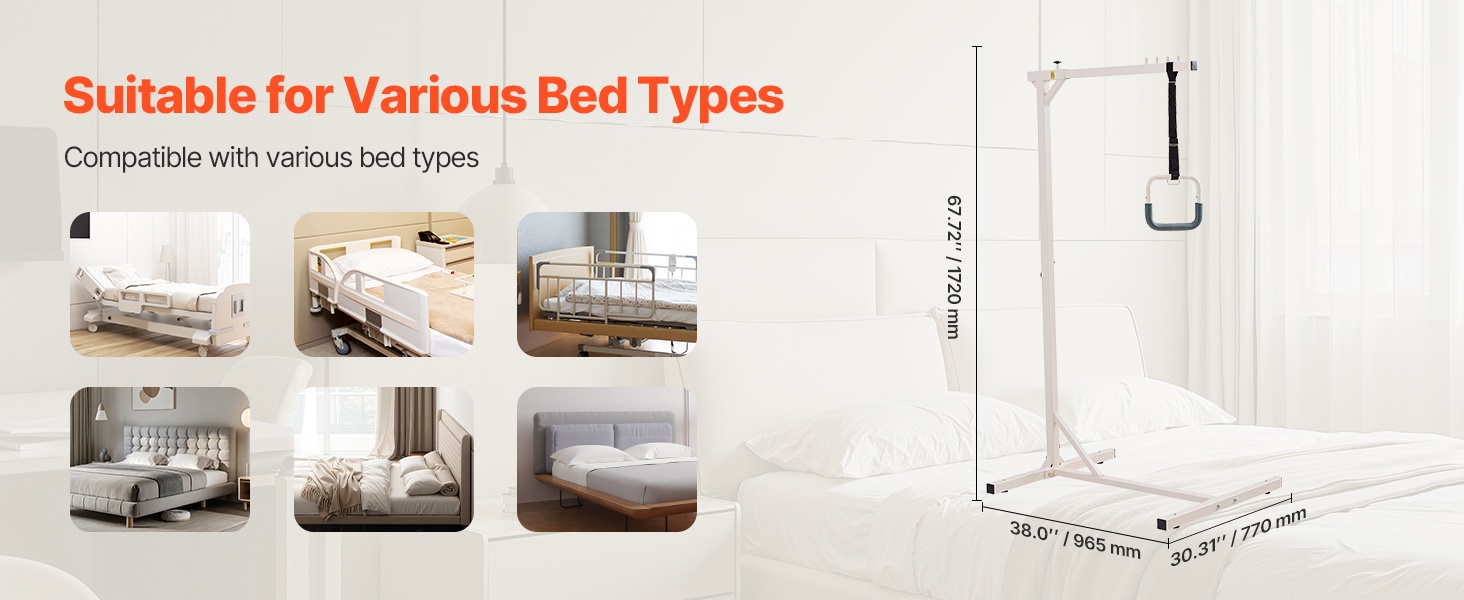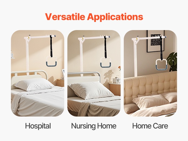 Puristinrakenteen ansiosta trapetsitanko sopii tavallisiin kotisänkyihin, hoitosänkyihin ja sairaalasänkyihin, kunhan päätylevyn paksuus on enintään 2 inches. Se auttaa käyttäjää muuttamaan asentoa turvallisesti ja tukee liikkumiskyvyn säilymistä ja paranemista.